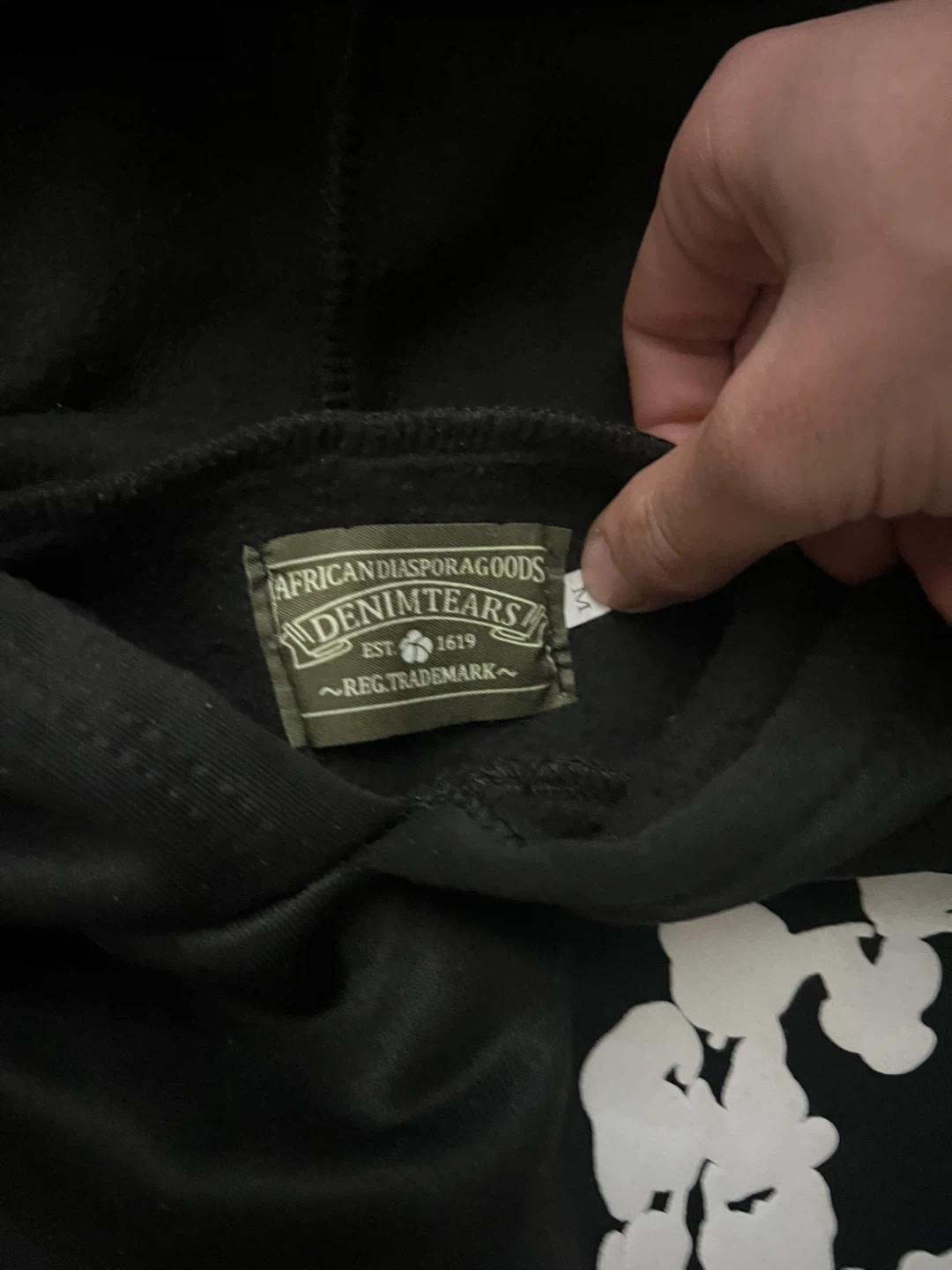 Black hoodie with white floral print by Denim Tears. Size medium. Features a front pouch pocket and adjustable drawstring hood. Made from a soft cotton blend.