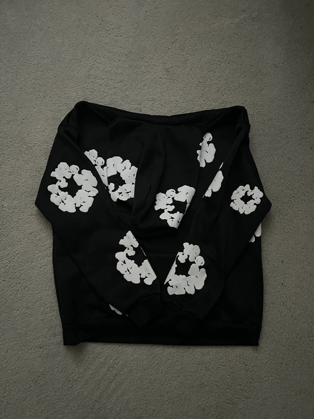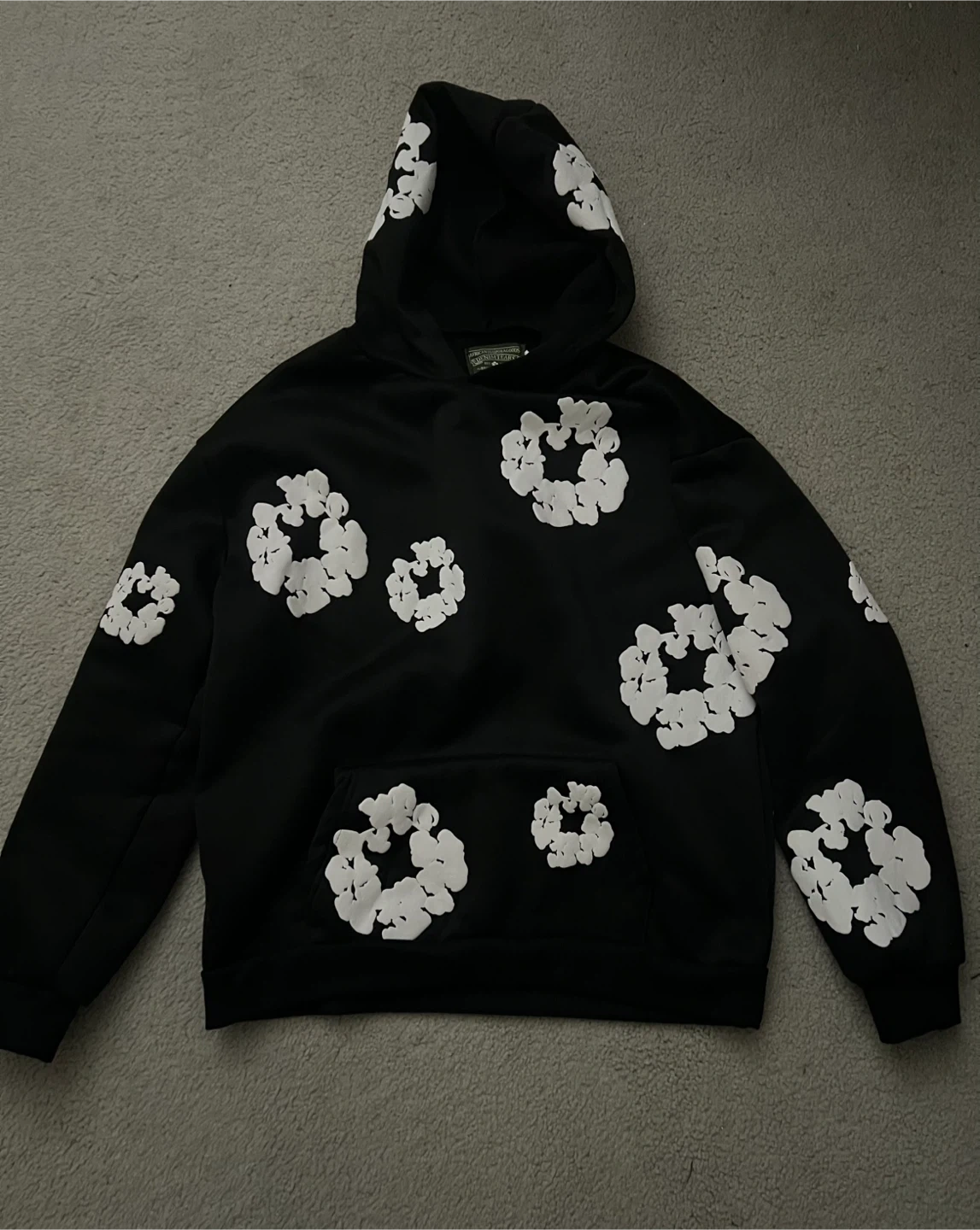 Black hoodie with white floral print by Denim Tears. Size medium. Features a front pouch pocket and adjustable drawstring hood. Made from a soft cotton blend.