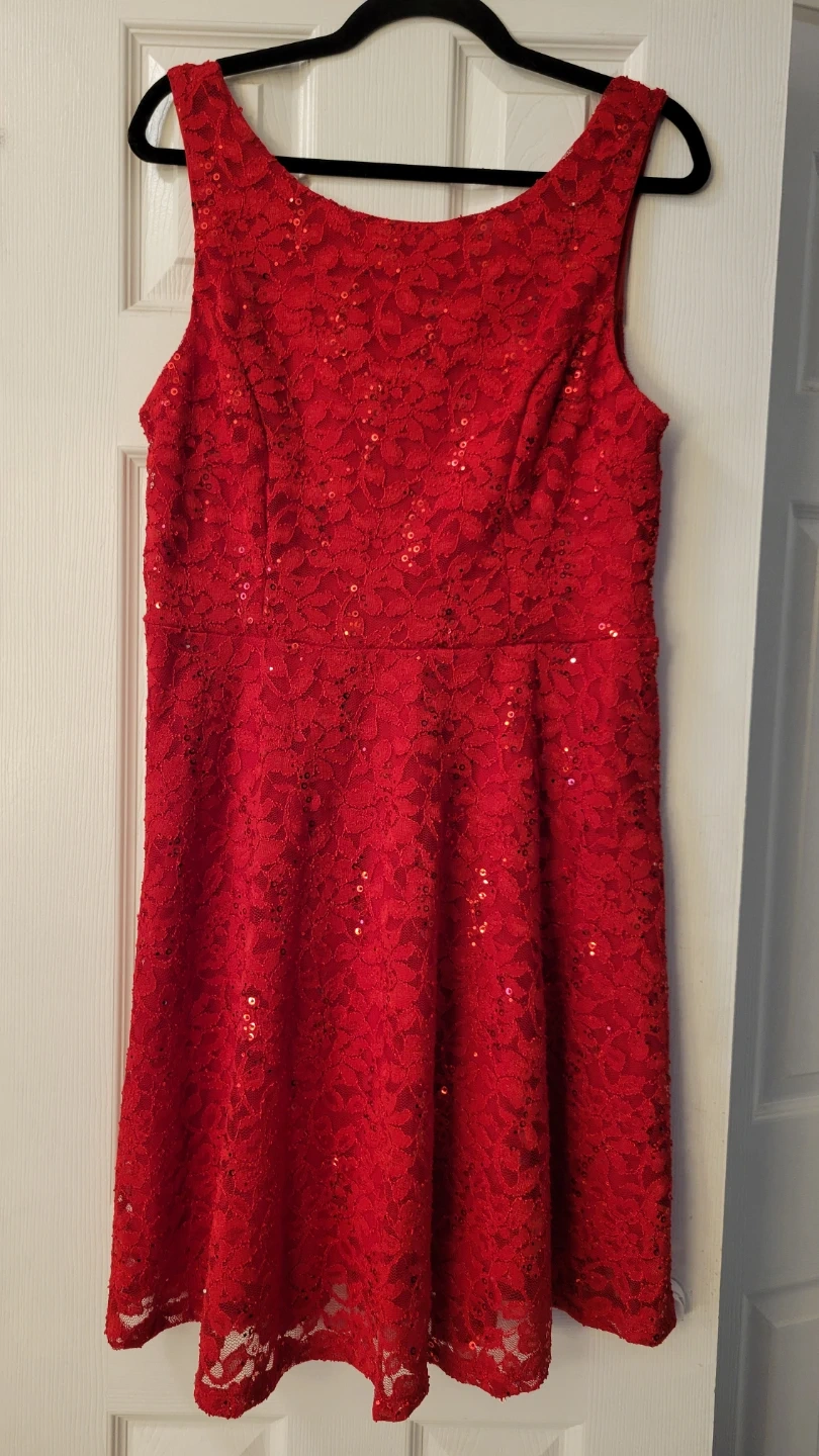 Sparkly red lace dress, size medium. It features a lovely floral lace pattern with subtle sequins for a touch of sparkle. Perfect for a special occasion or Valentine's day.