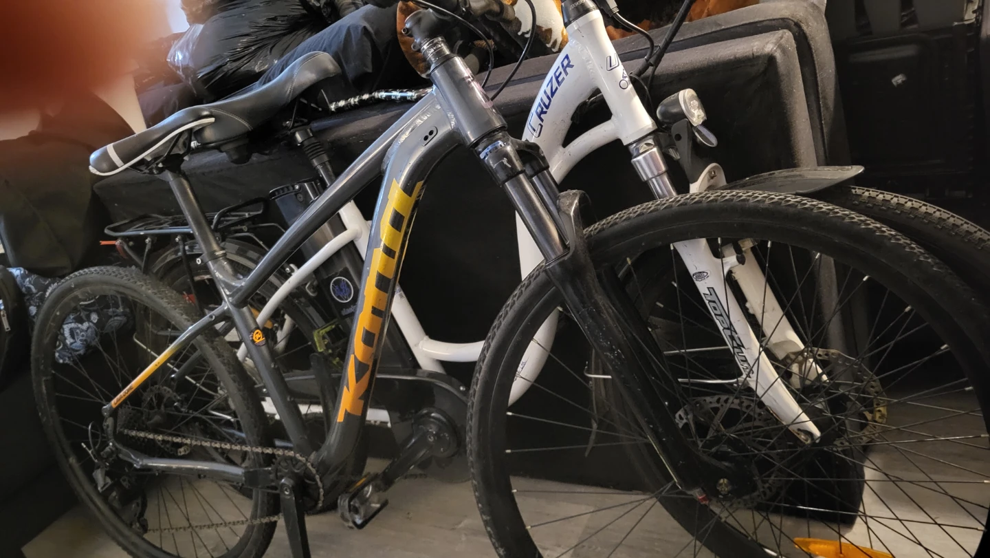 This is a Kona Lava Dome mountain bike. It's a durable bike with a grey frame and yellow accents. It's equipped with disc brakes for reliable stopping power. This bike would be great for trail riding or daily commutes! 28" tires Medium frame.