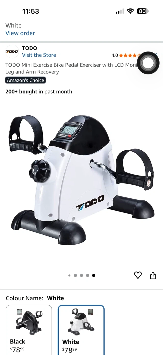 Selling a TODO mini exercise bike pedal exerciser in great condition! It's perfect for leg and arm recovery, and features an LCD monitor to track your progress. The bike is white and black, and it's lightweight and portable. The dimensions are 15" x 13.5" x 12.5".