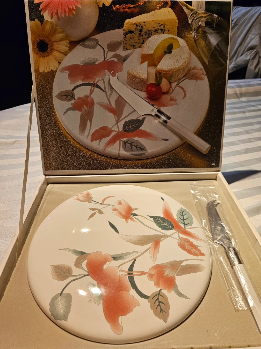 Mikasa FX003 Silk Flowers cheese board with a matching knife. Oven to table to dishwasher safe. Made in Japan.