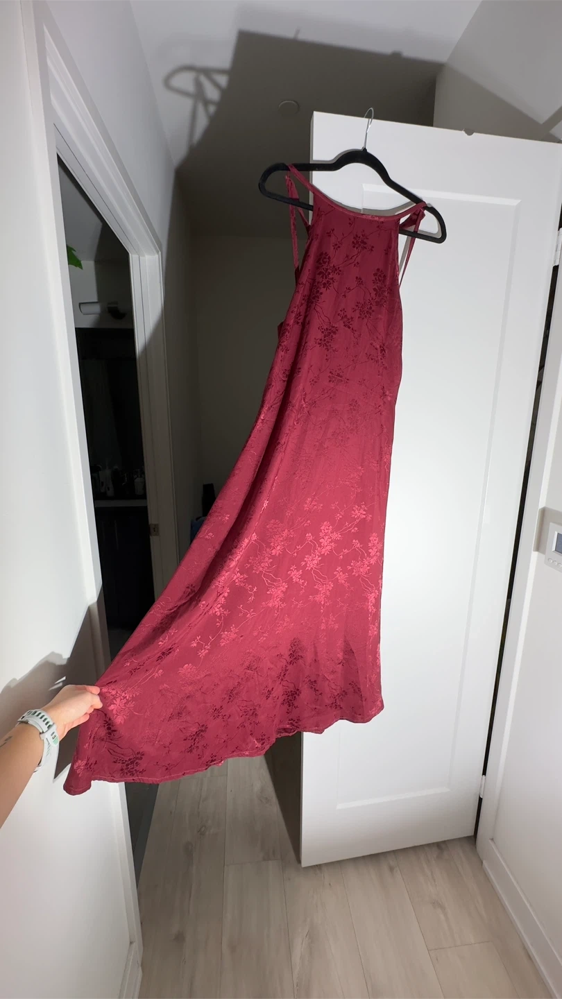 Selling a beautiful burgundy maxi dress with a subtle floral pattern. It's in great condition and perfect for a special occasion or a night out. The dress features a unique back design with delicate straps. It is made of a comfortable material that drapes nicely.