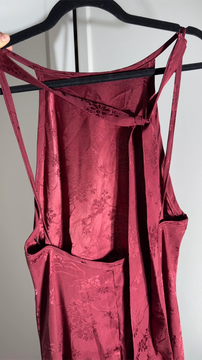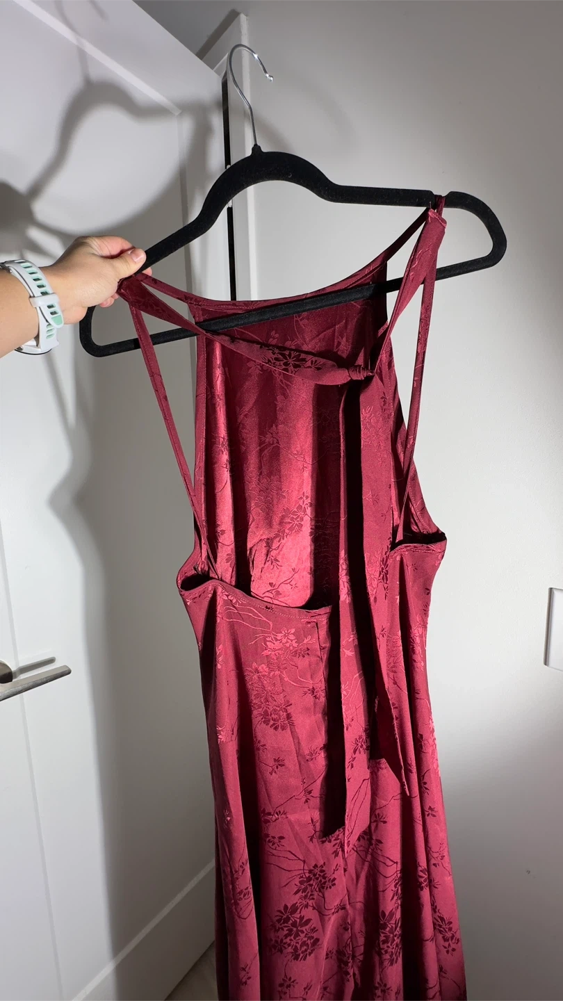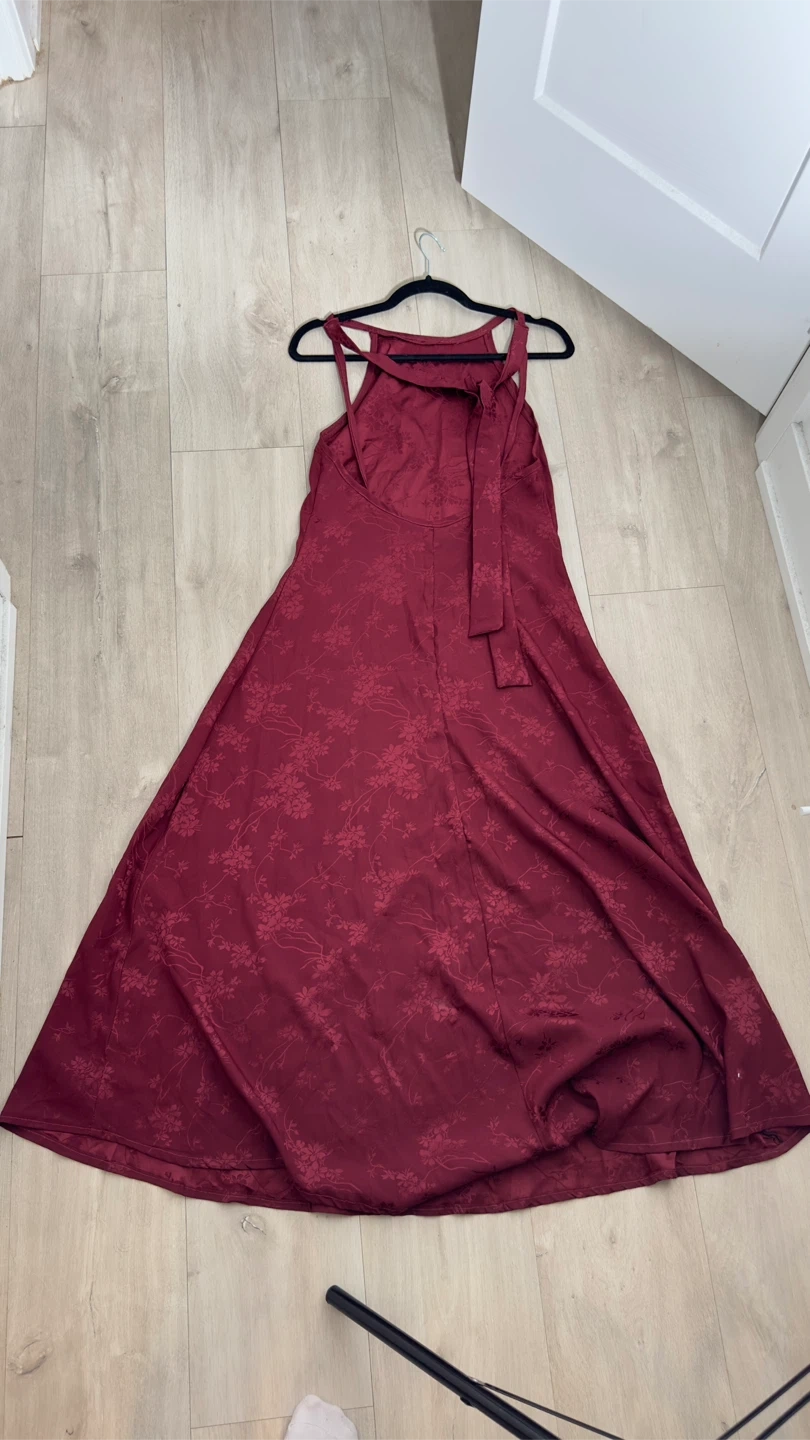 Selling a beautiful burgundy maxi dress with a subtle floral pattern. It's in great condition and perfect for a special occasion or a night out. The dress features a unique back design with delicate straps. It is made of a comfortable material that drapes nicely.