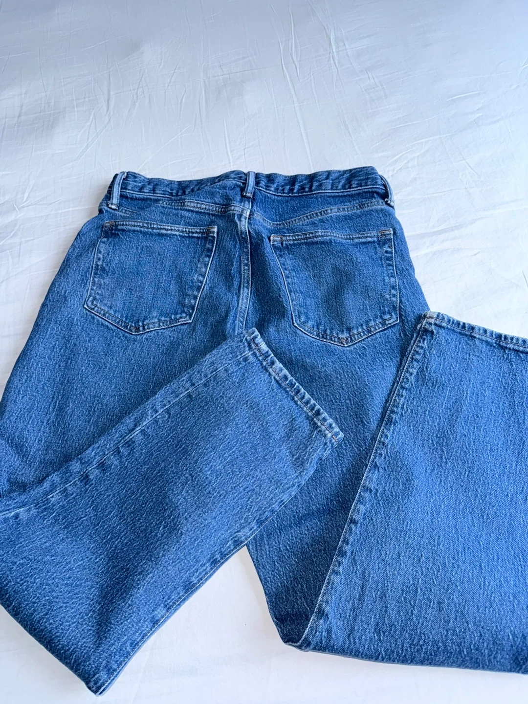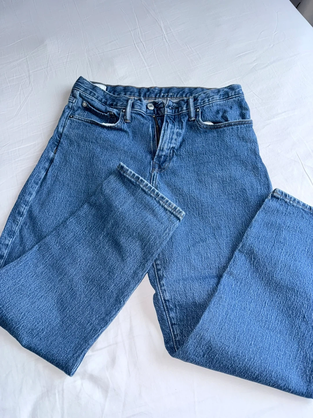 These are GAP Relaxed Taper jeans. The size is 31 waist and 30 length. They're made of denim.