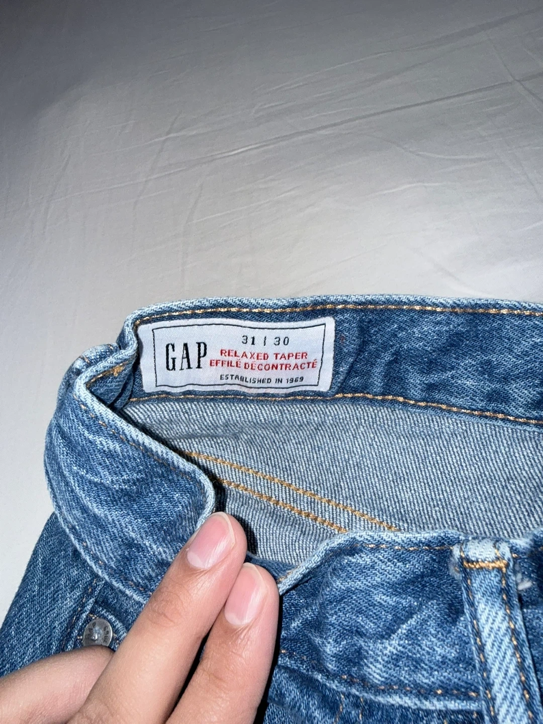 These are GAP Relaxed Taper jeans. The size is 31 waist and 30 length. They're made of denim.