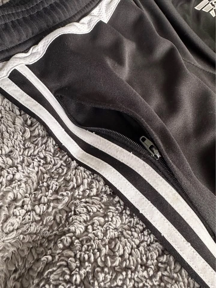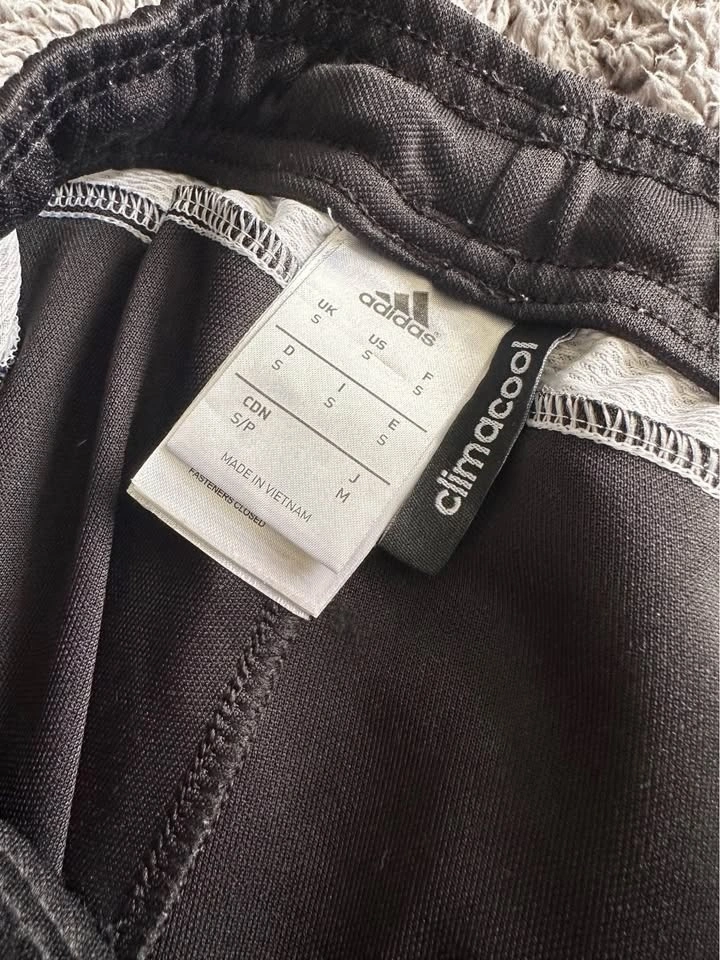 Brand: Adidas. Technology: CLIMACOOL (Breathable and moisture-wicking). Design: Black pants with white stripes and logo, zippered pockets. Condition: Excellent Condition. Size: Tag says Small (S), but they are known to run a bit large and can comfortably fit a Medium (M).