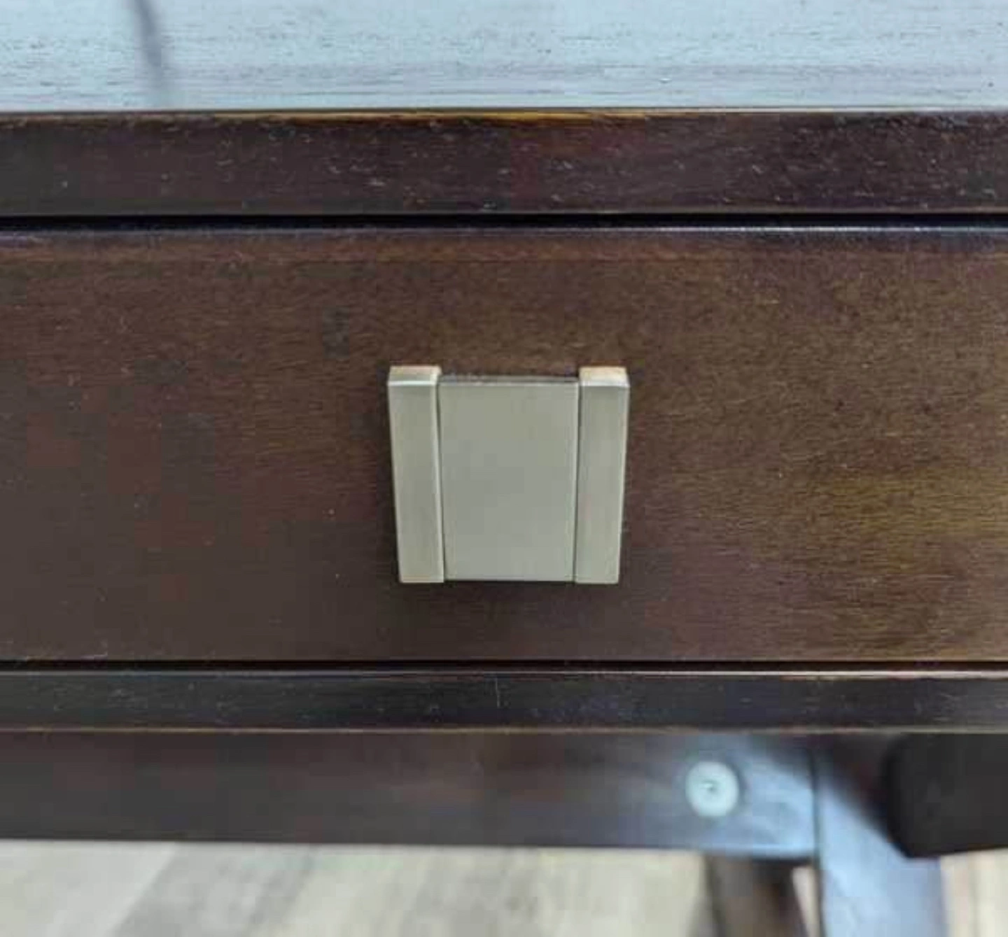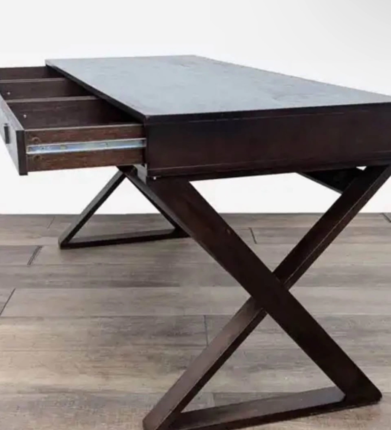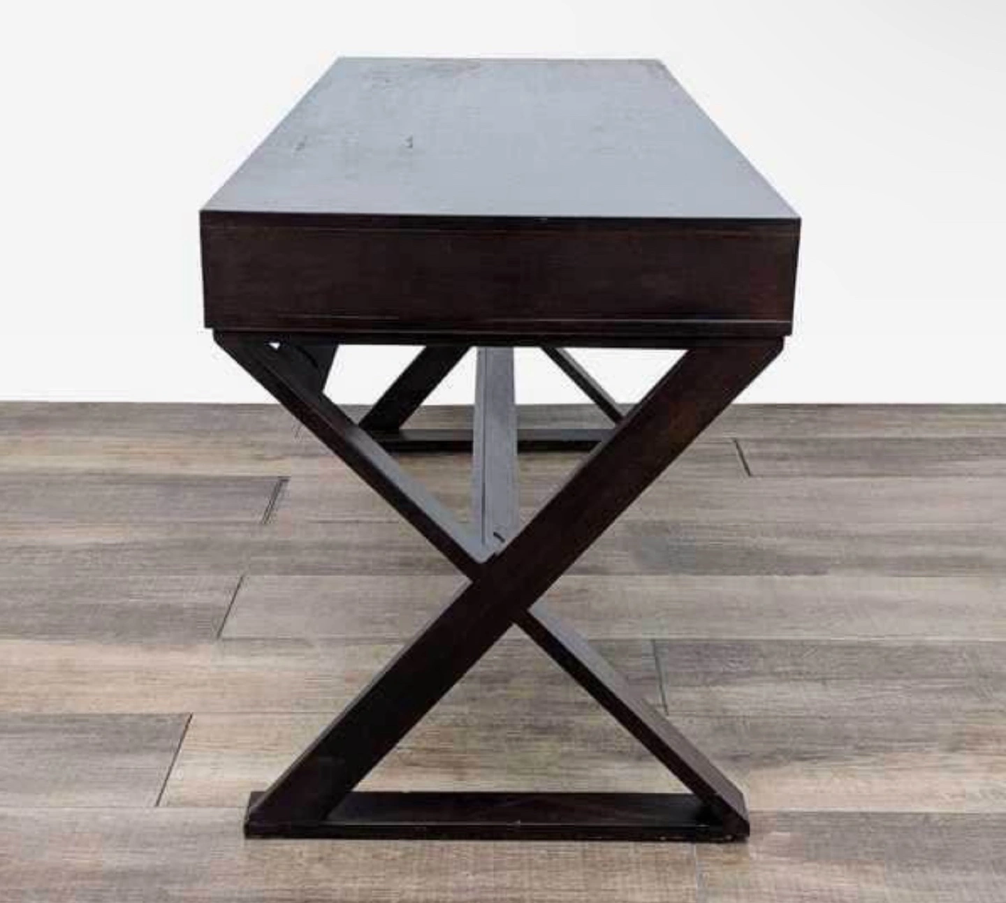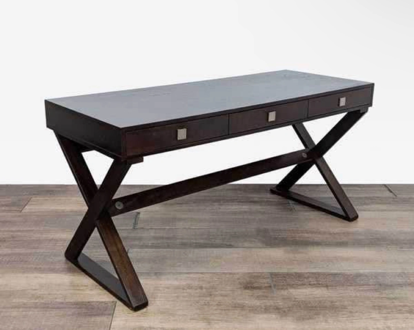 Modern style writing desk. Features three drawers and unique X-shaped legs. Dark brown wood finish. Sturdy construction.