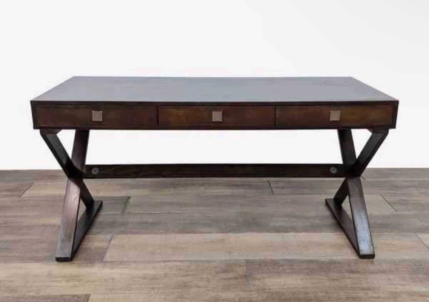 Dark Brown Wooden Desk with Three Drawers and X-Shaped Legs