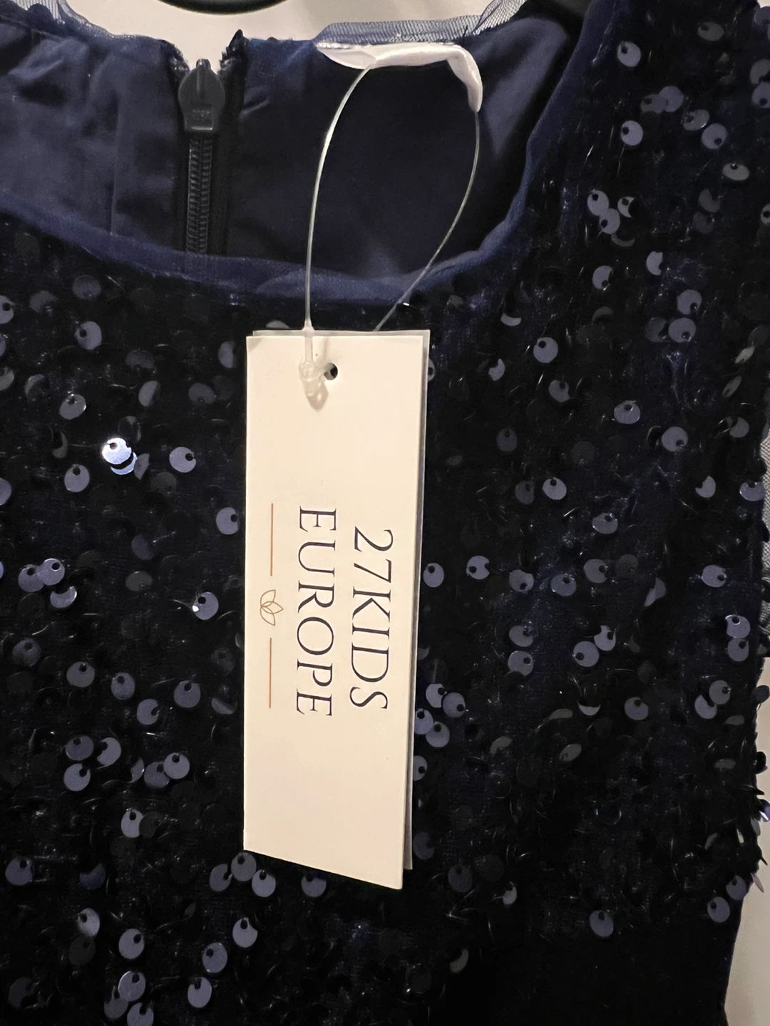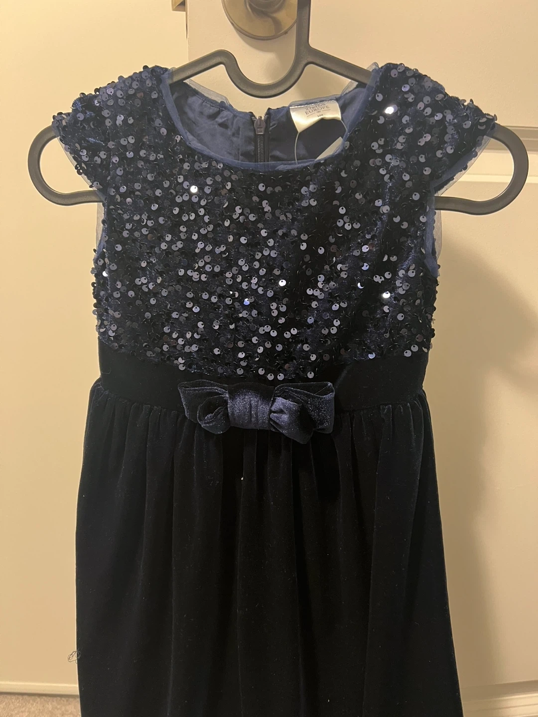 Navy blue velvet dress with sparkly sequin bodice and a satin bow accent. Cap sleeves and back zipper closure. Perfect for special occasions!