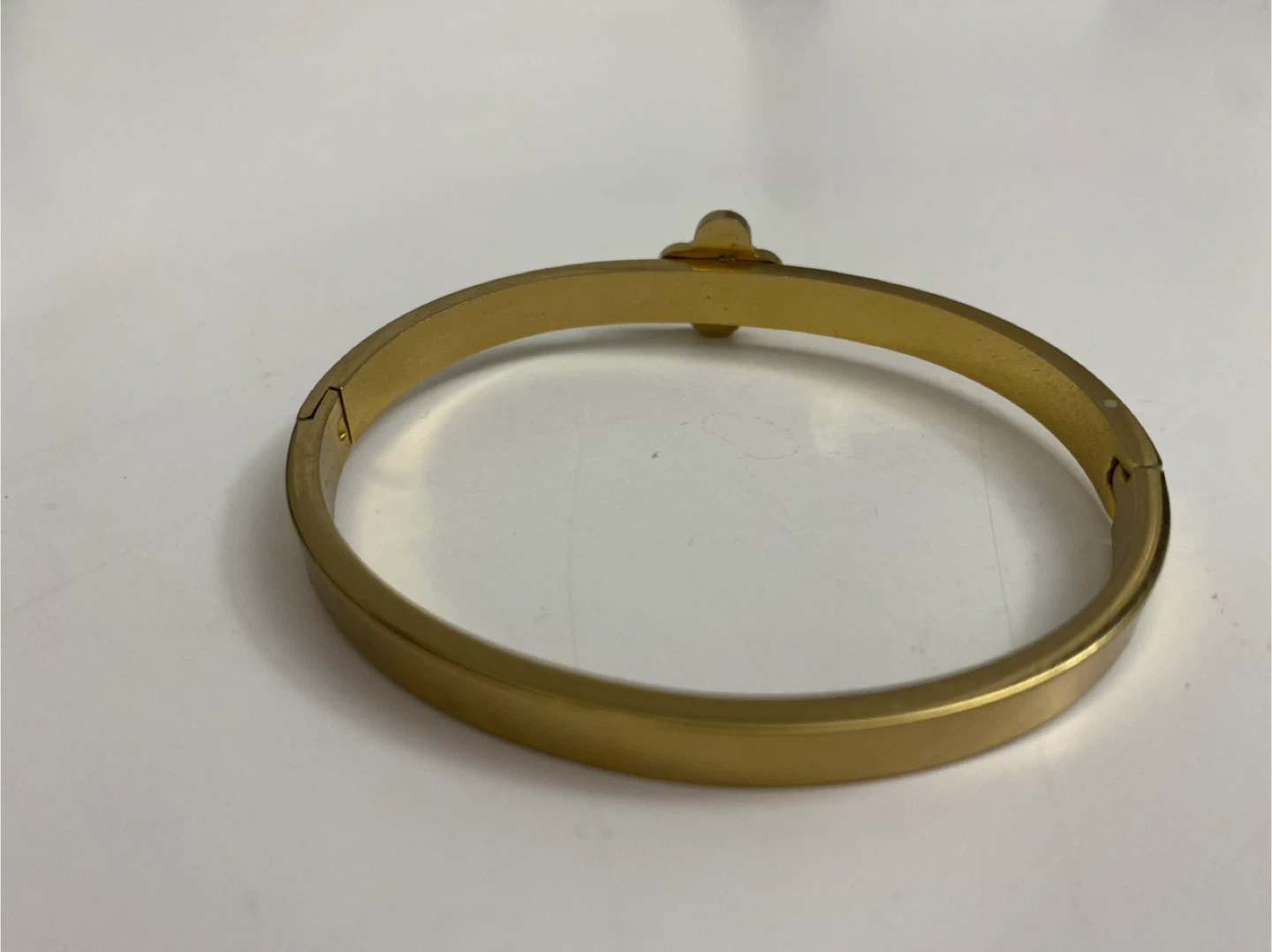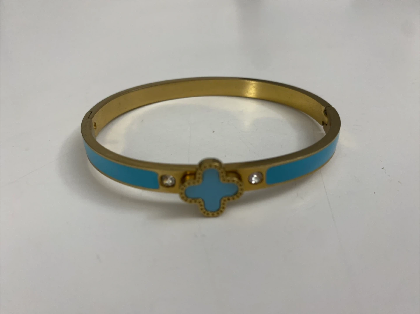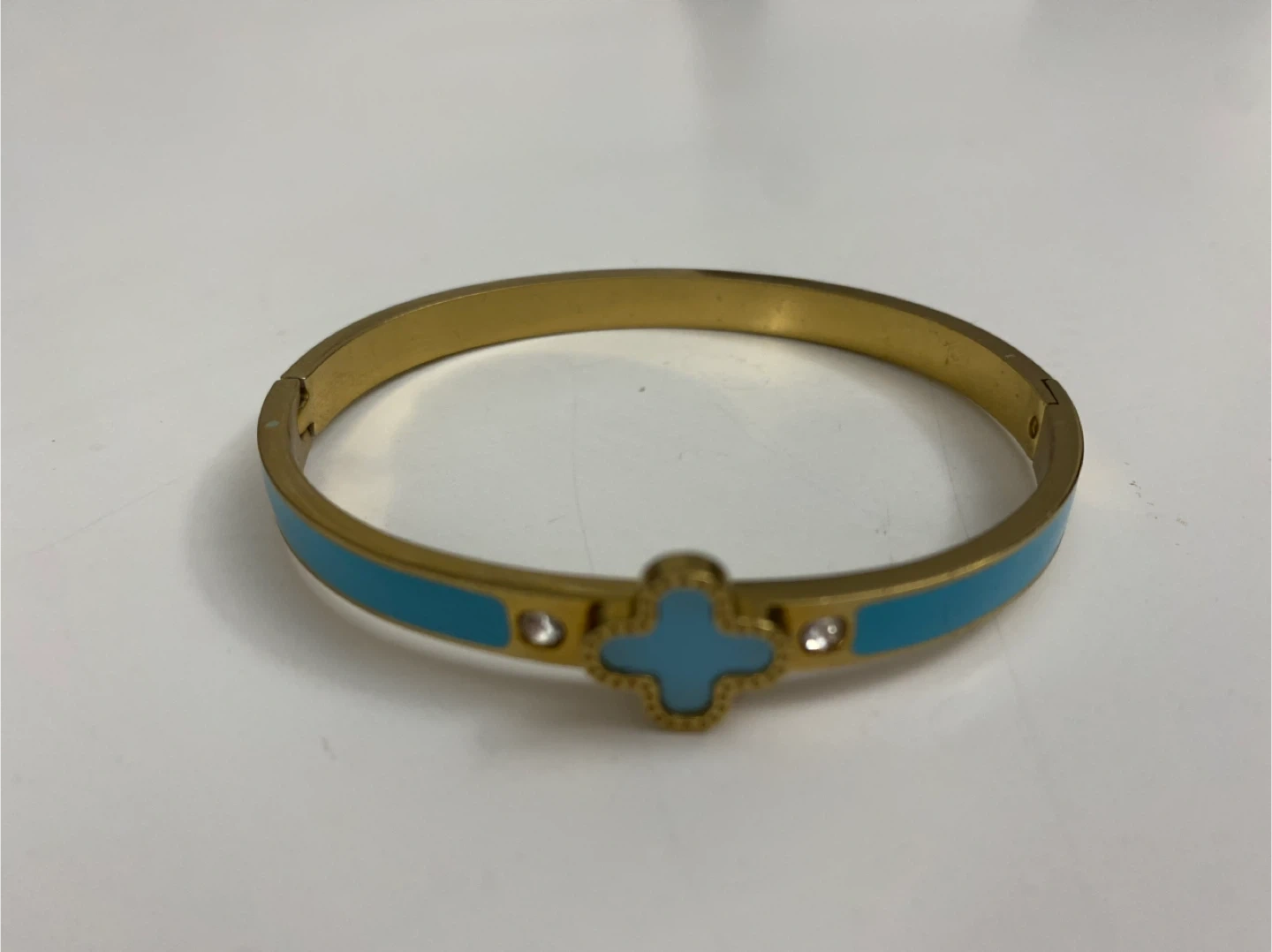 This is a gold tone bangle bracelet with a blue clover design. It features small clear accent stones. Its clasp closure makes it easy to wear. I got it as a gift, but not my style.