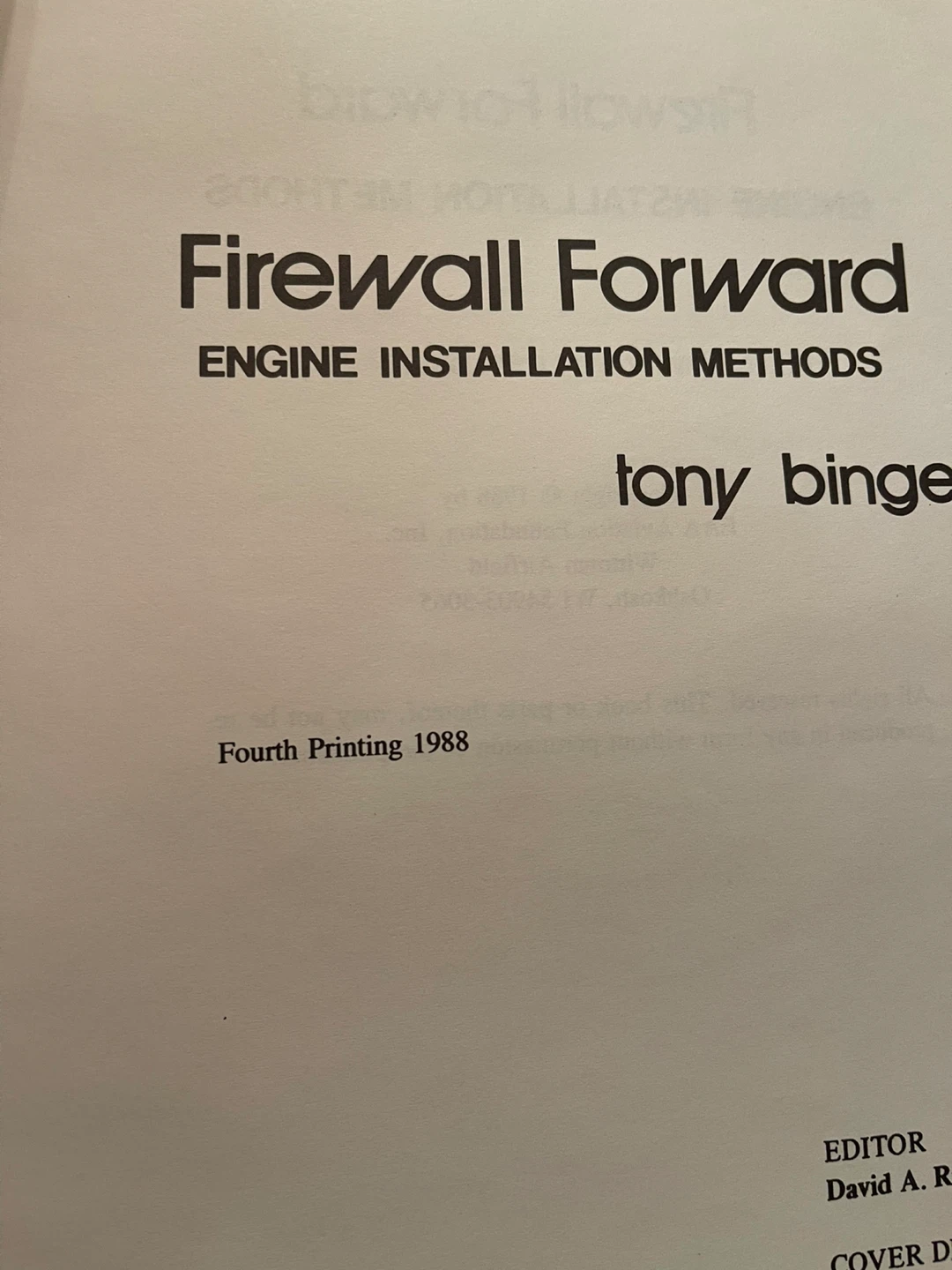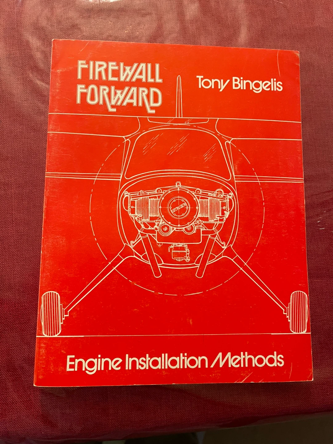 Selling the book Firewall Forward: Engine Installation Methods by Tony Bingelis. It's a great resource for anyone interested in engine installation techniques. Pages 171-174 are loose. Cash only