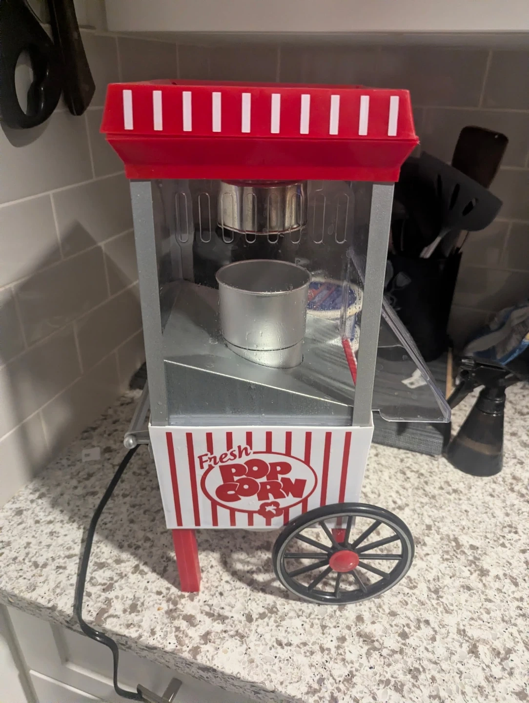This fun popcorn maker cart is designed to look like a classic movie theatre popcorn machine. It pops up to 8 cups of popcorn per batch, perfect for movie nights or parties. Includes a scoop and measures approximately 17 inches tall.