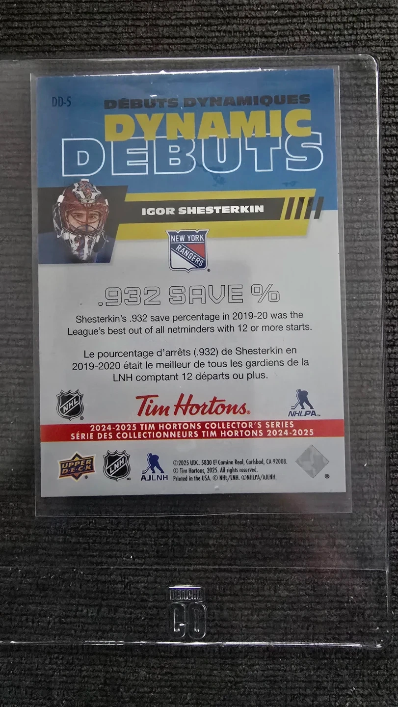 This is a mint condition Dynamic Debuts hockey card featuring Igor Shesterkin. It highlights his .932 save percentage from the 2019-20 season. The card is part of the 2024-2025 Tim Hortons Collector's Series.