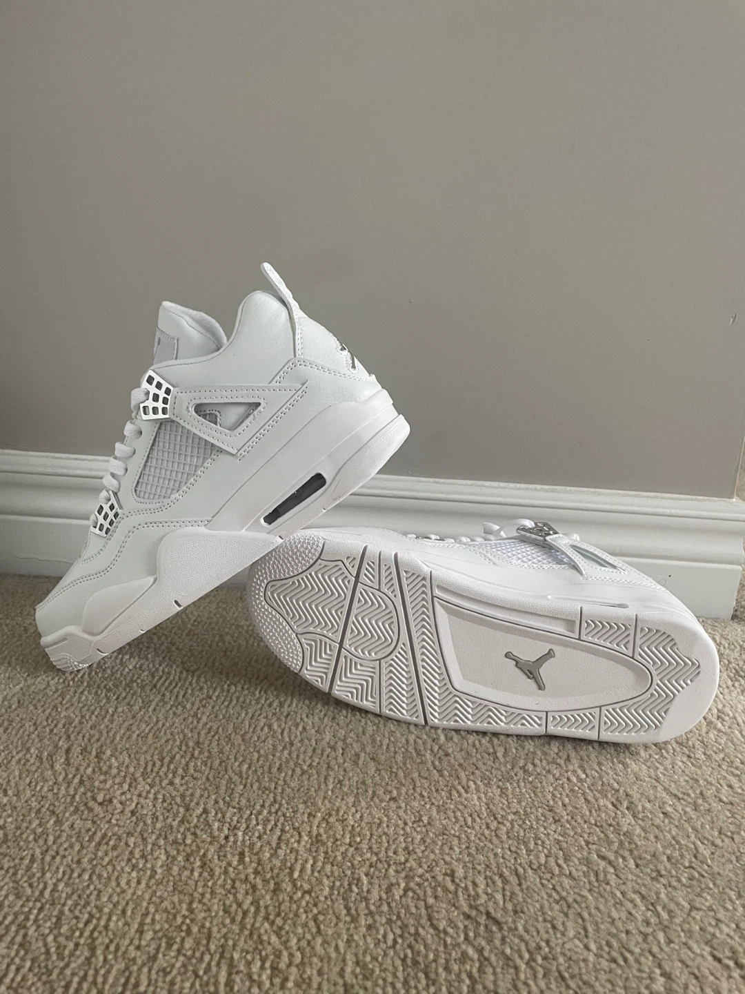 These are a pair of Air Jordan 4 "White Oreo" sneakers. They feature a white leather upper with black accents and a visible Air unit in the sole. Includes original tags.
