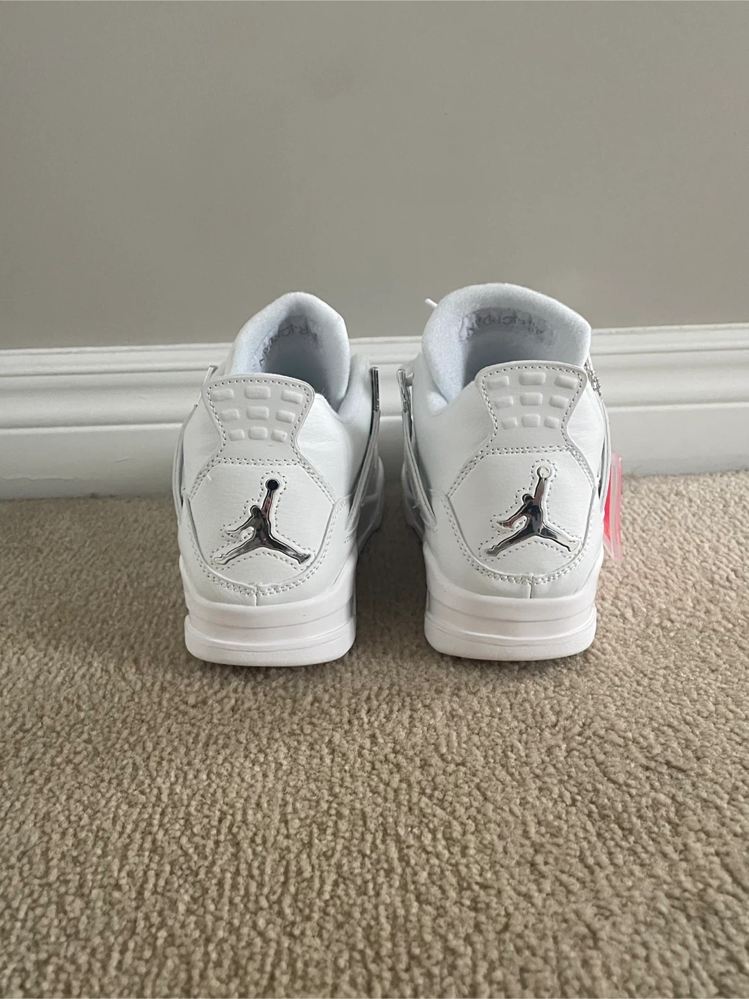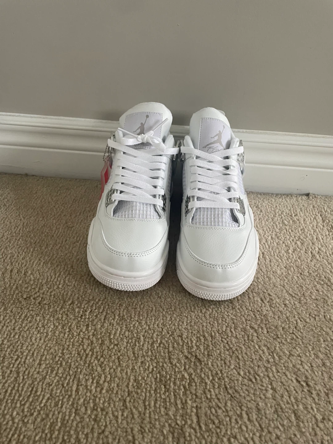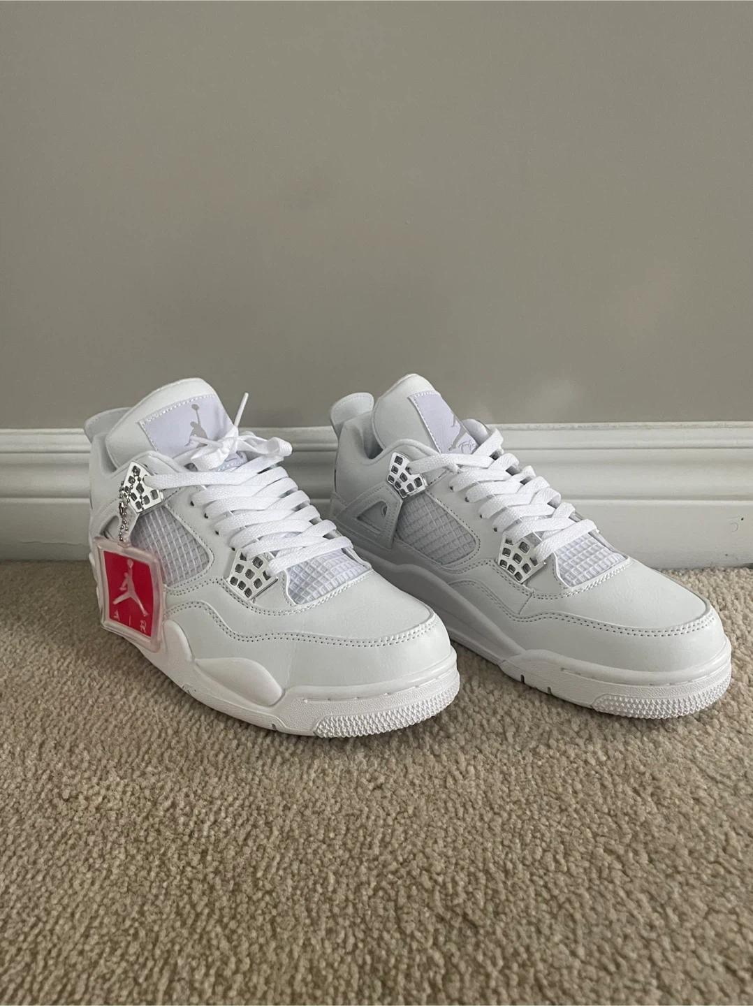These are a pair of Air Jordan 4 "White Oreo" sneakers. They feature a white leather upper with black accents and a visible Air unit in the sole. Includes original tags.