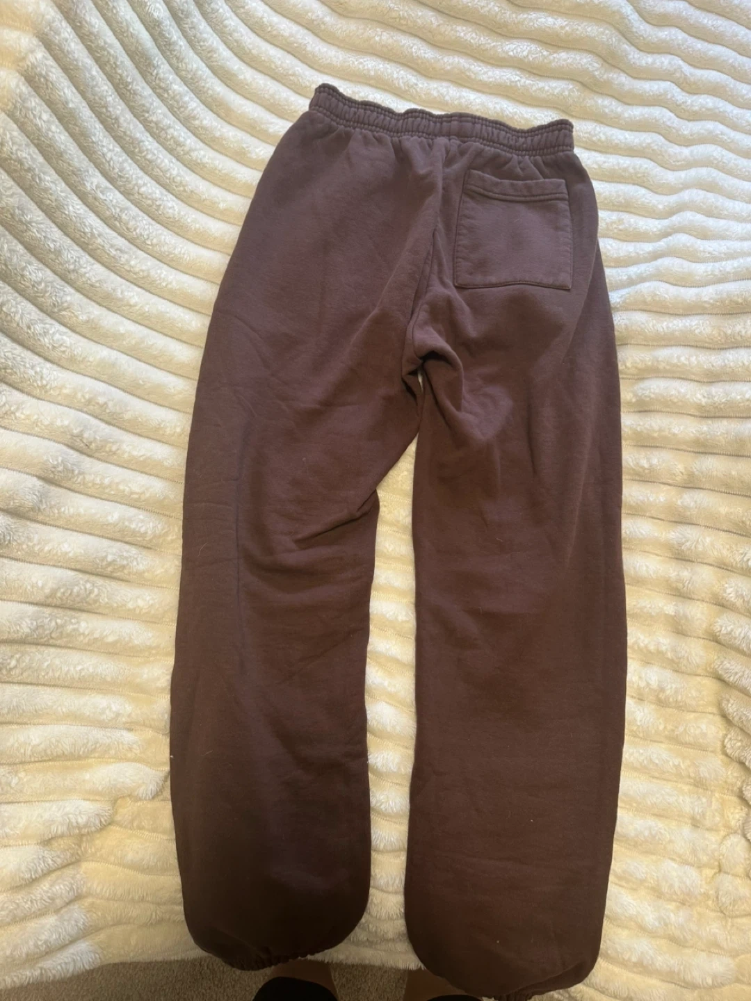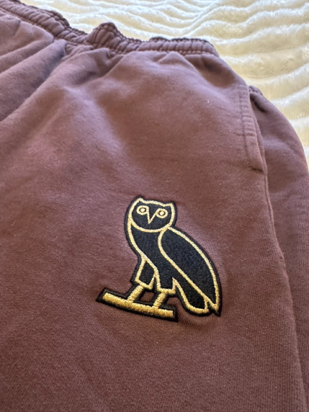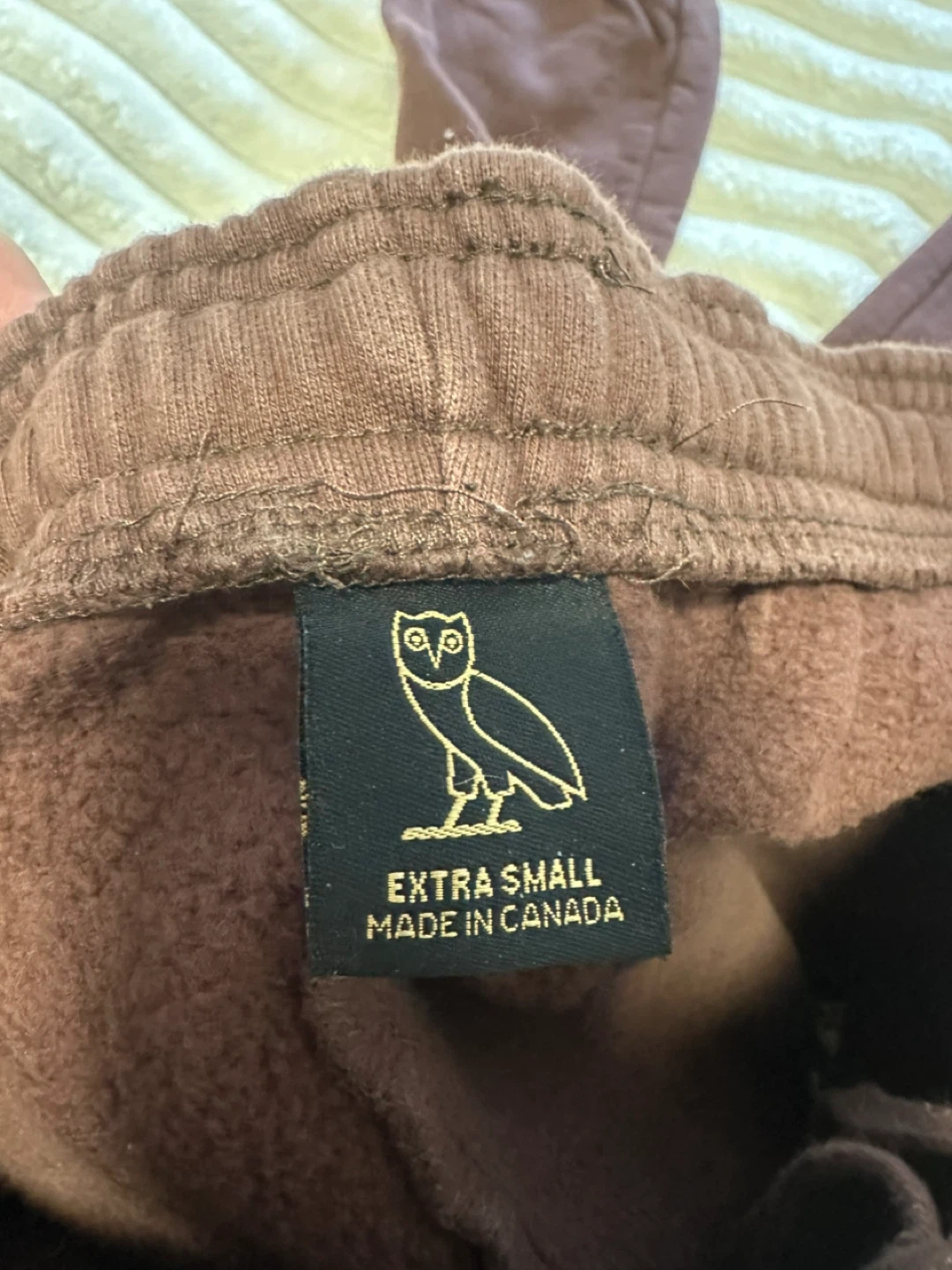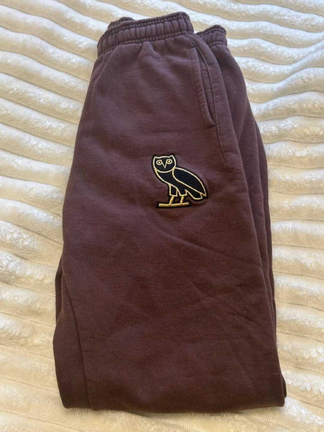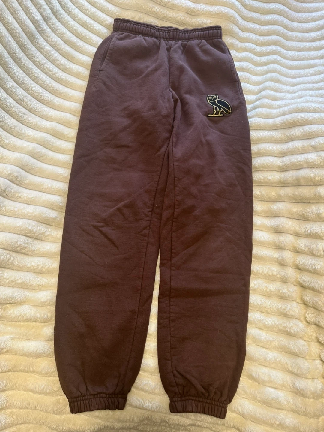 These are OVO sweatpants in extra small. Made in Canada. These sweatpants are a rich brown colour and feature the iconic OVO owl logo embroidered on the leg. They're made from a comfortable, soft material.