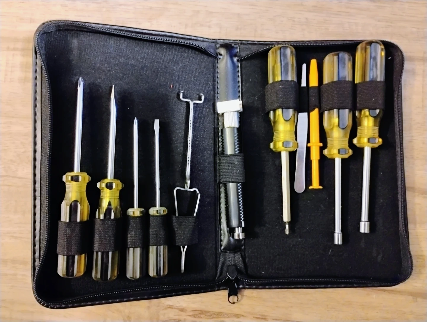 This is a set of screwdrivers and tools. It includes various screwdrivers with yellow handles and a small hook tool. The set comes in a black zippered case for easy storage. It's handy for small repairs or general use!