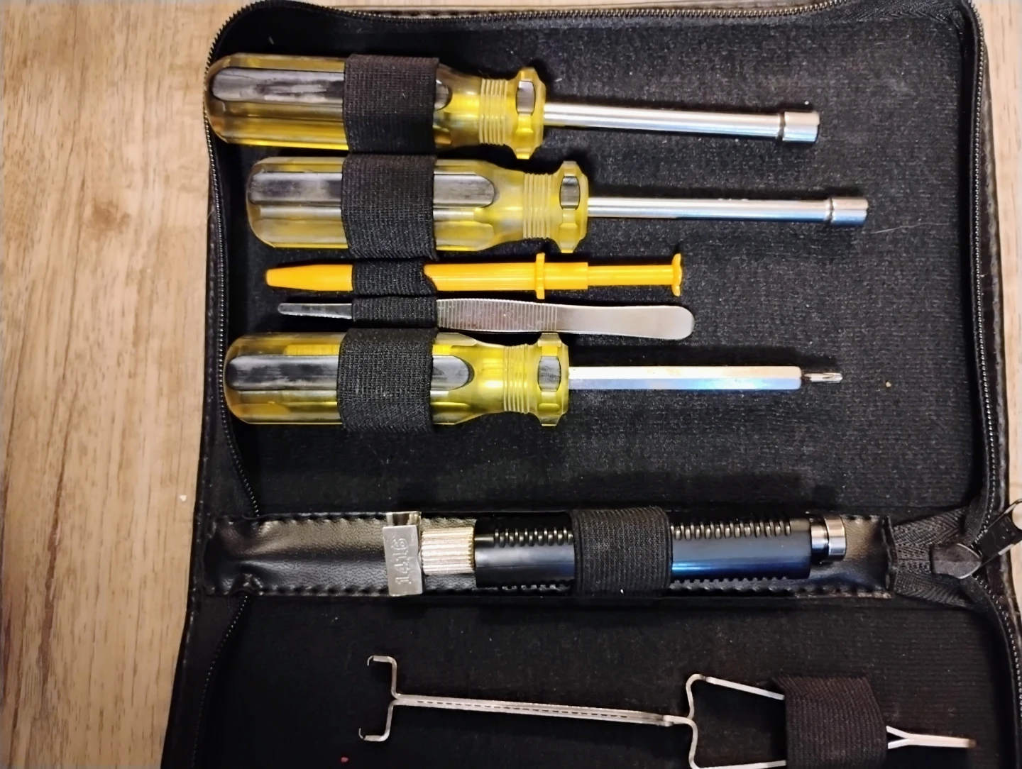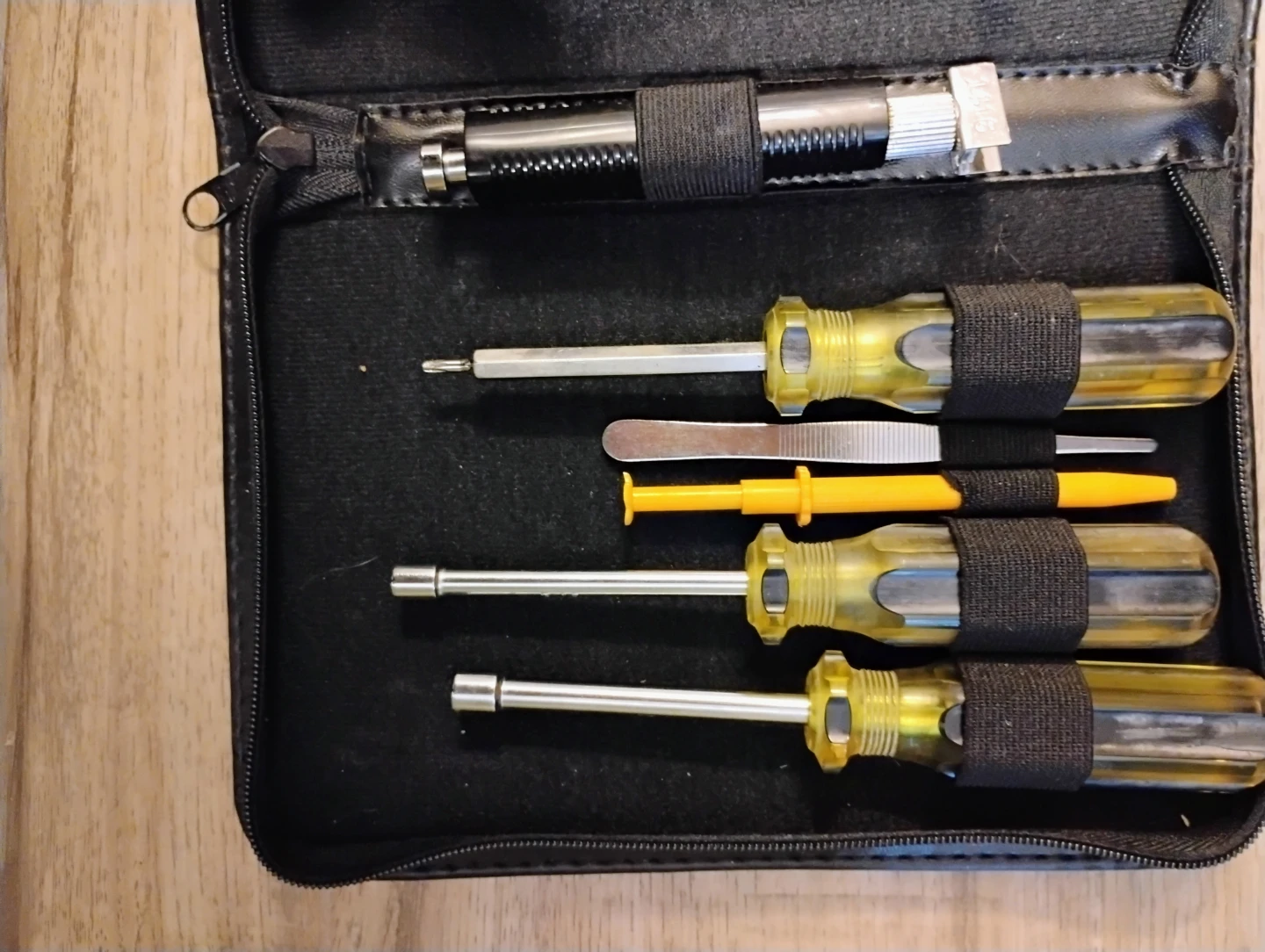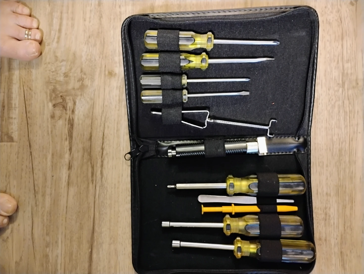 This is a set of screwdrivers and tools. It includes various screwdrivers with yellow handles and a small hook tool. The set comes in a black zippered case for easy storage. It's handy for small repairs or general use!
