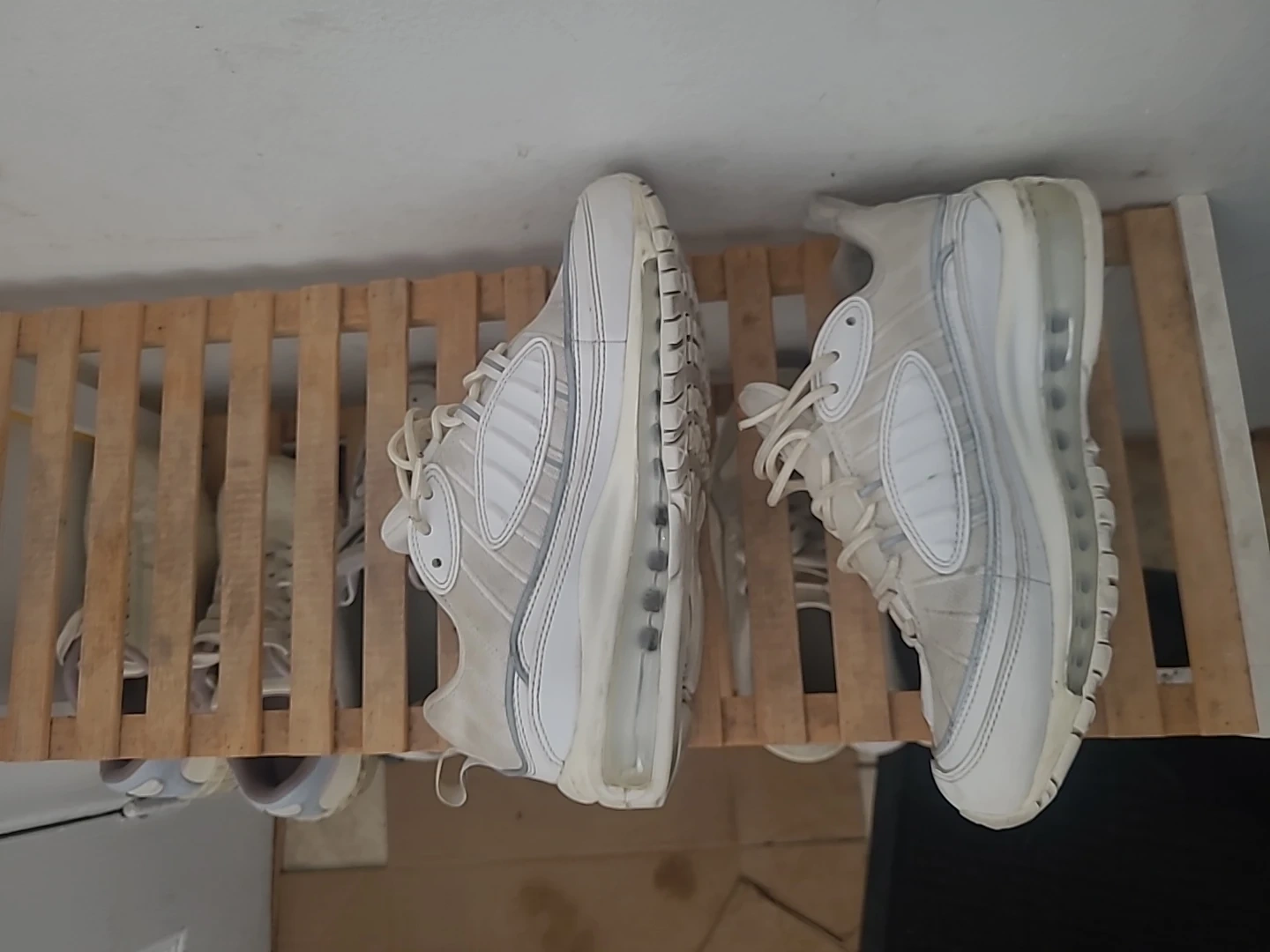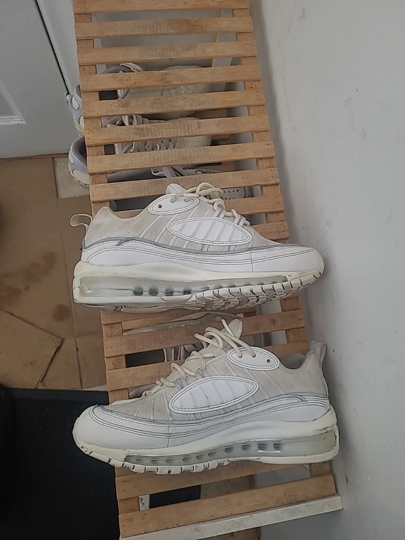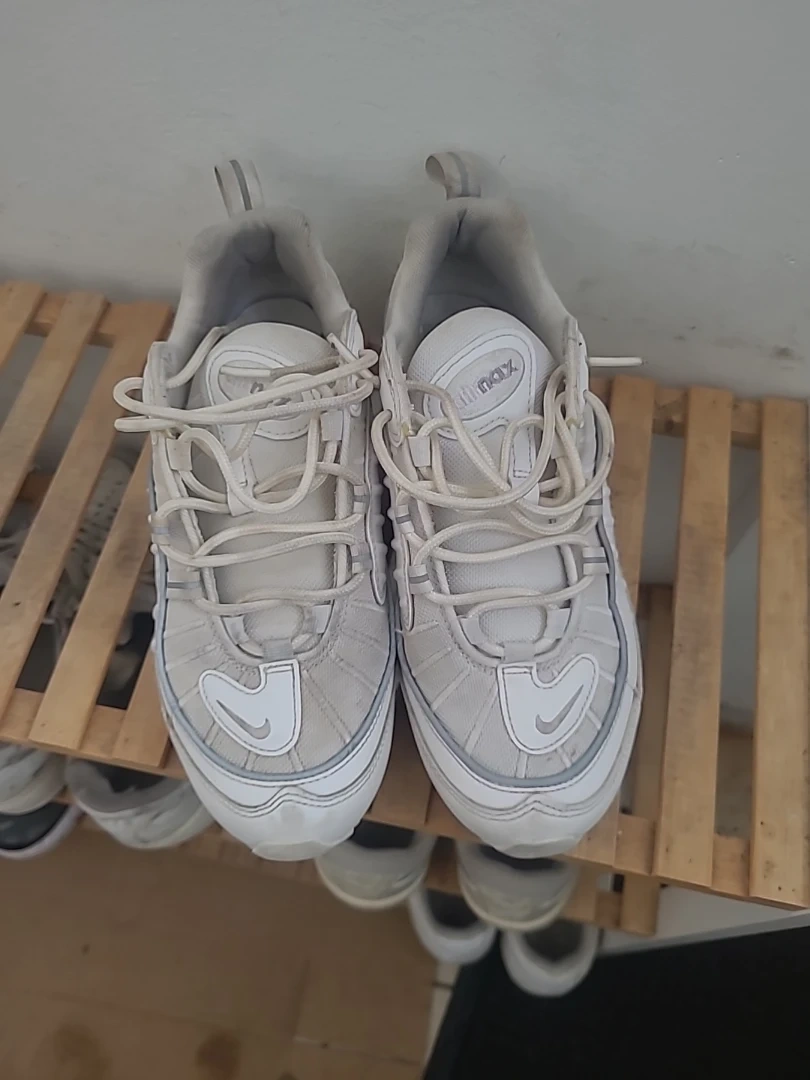 These are a pair of Nike Air Max 98 sneakers in a white colourway. They feature the iconic Air Max cushioning system. Great for casual wear or light athletic activities! Reflective too!