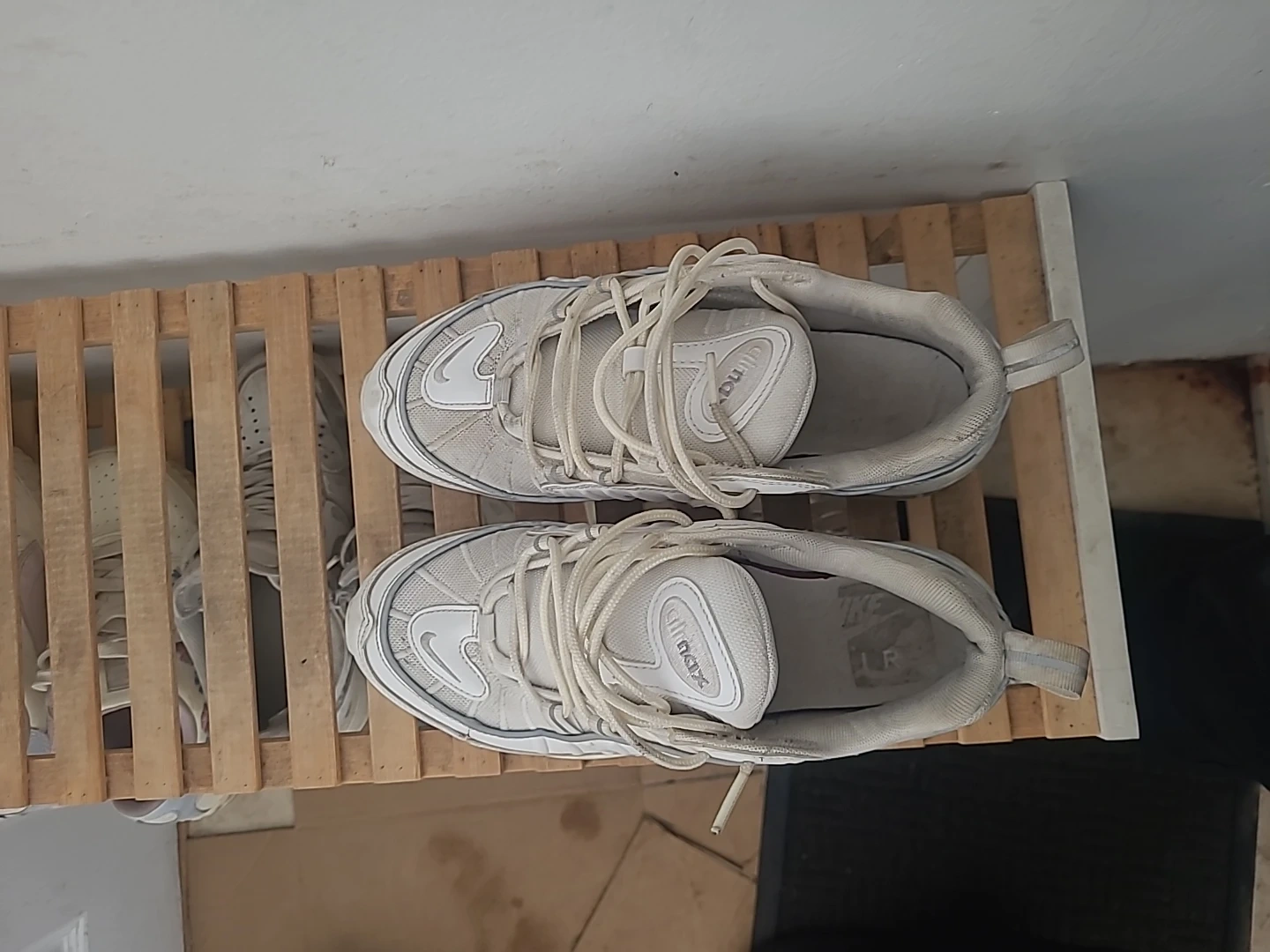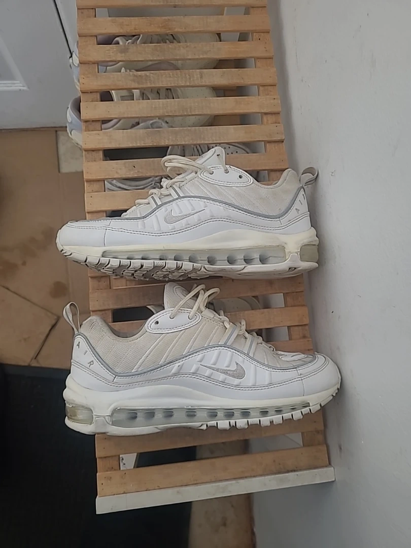These are a pair of Nike Air Max 98 sneakers in a white colourway. They feature the iconic Air Max cushioning system. Great for casual wear or light athletic activities! Reflective too!