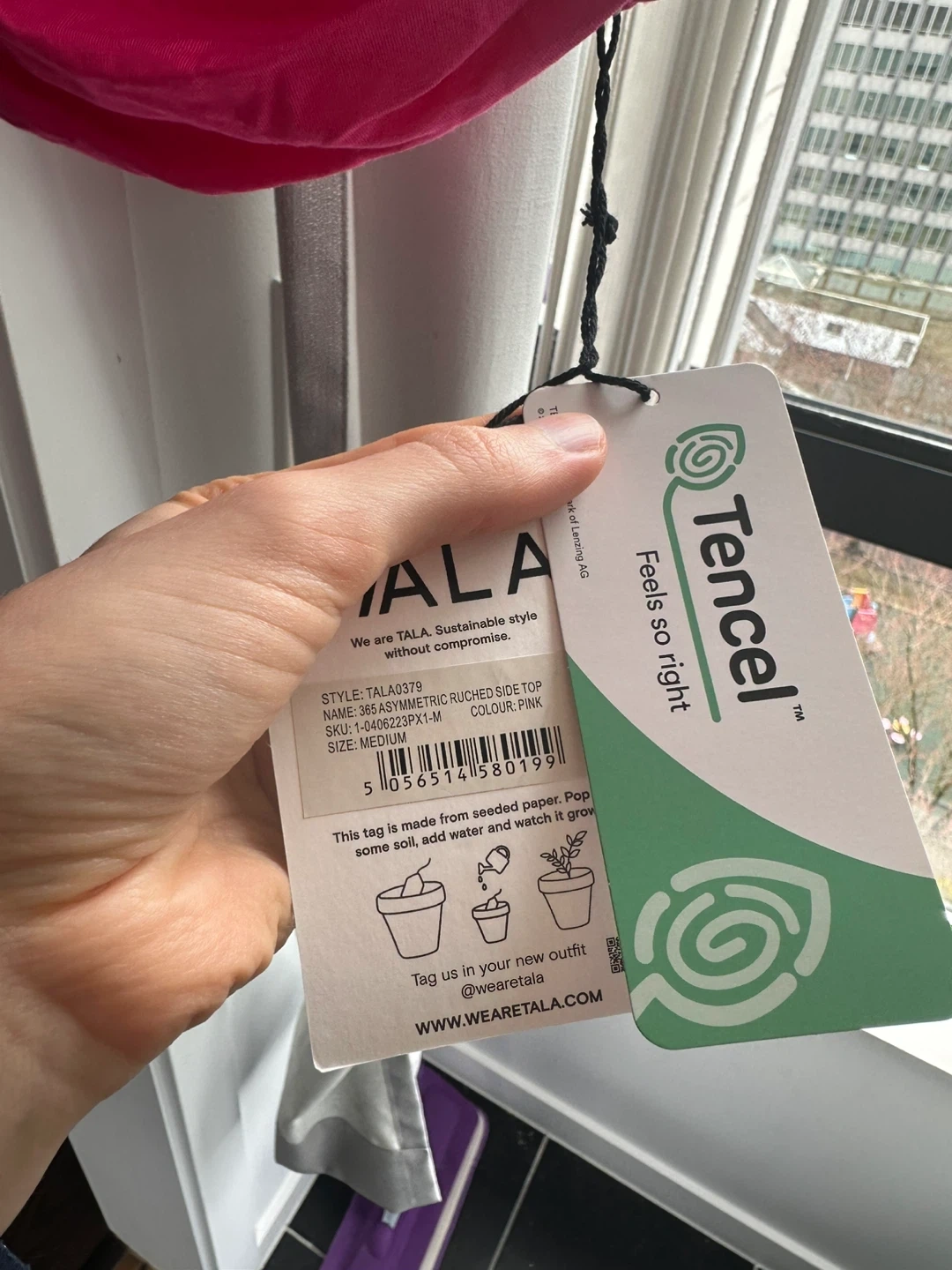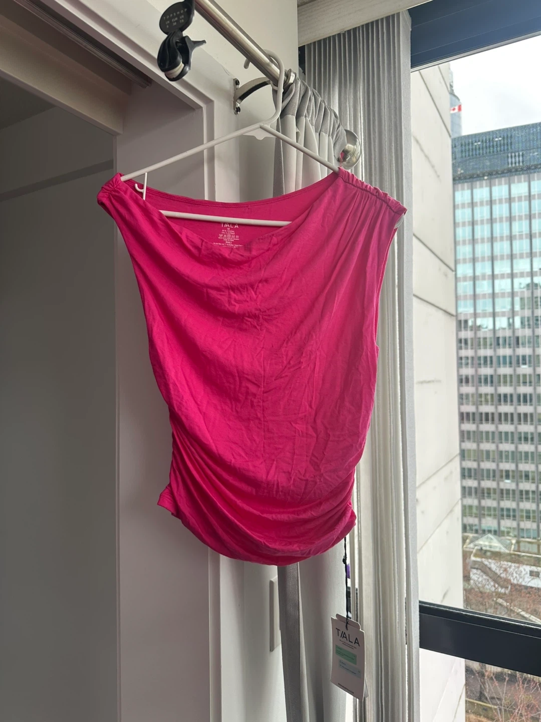 Tala 365 asymmetric ruched side top in pink. Made with Tencel Modal fibers for long-lasting natural comfort and softness. Size medium. Includes original tags.