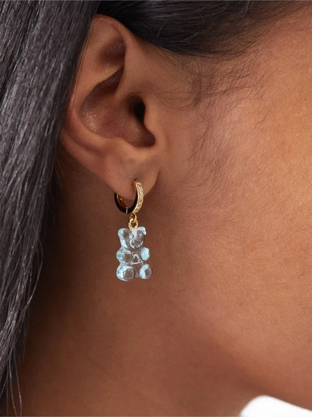 • Bottom: Blue gummy bear drop earrings hanging from gold-tone hoops accented with small crystals.