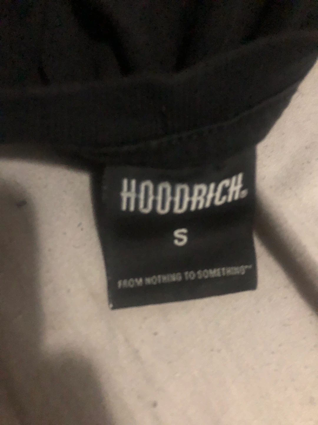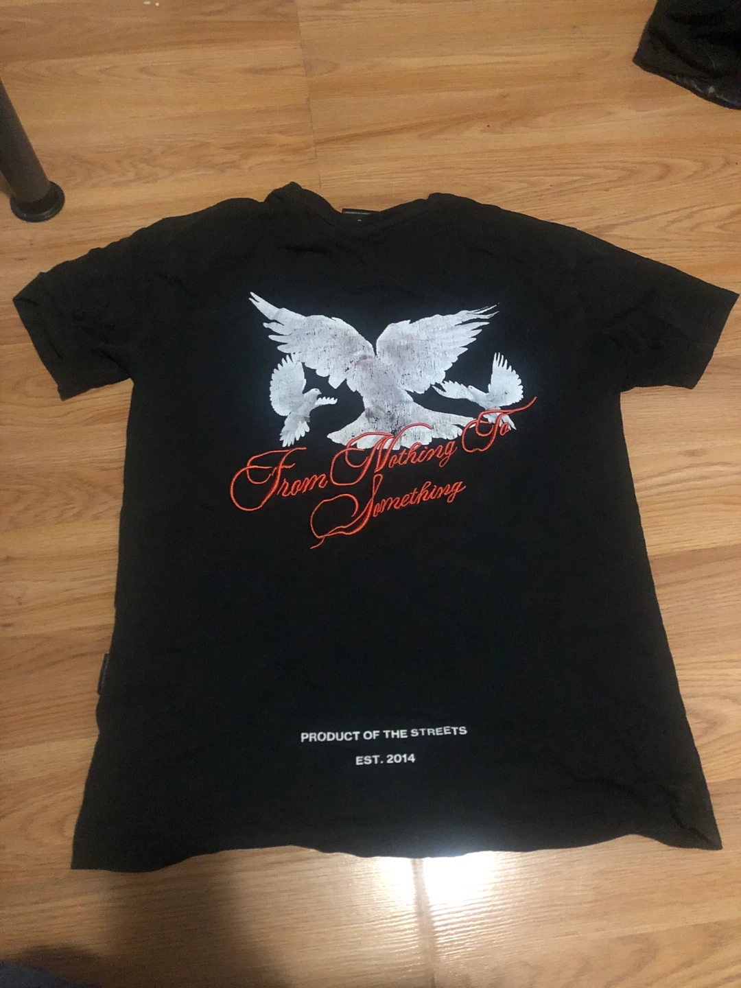 Black Hoodrich t-shirt with a dove graphic on the front. It's size small. Product of the Streets, Est. 2014.