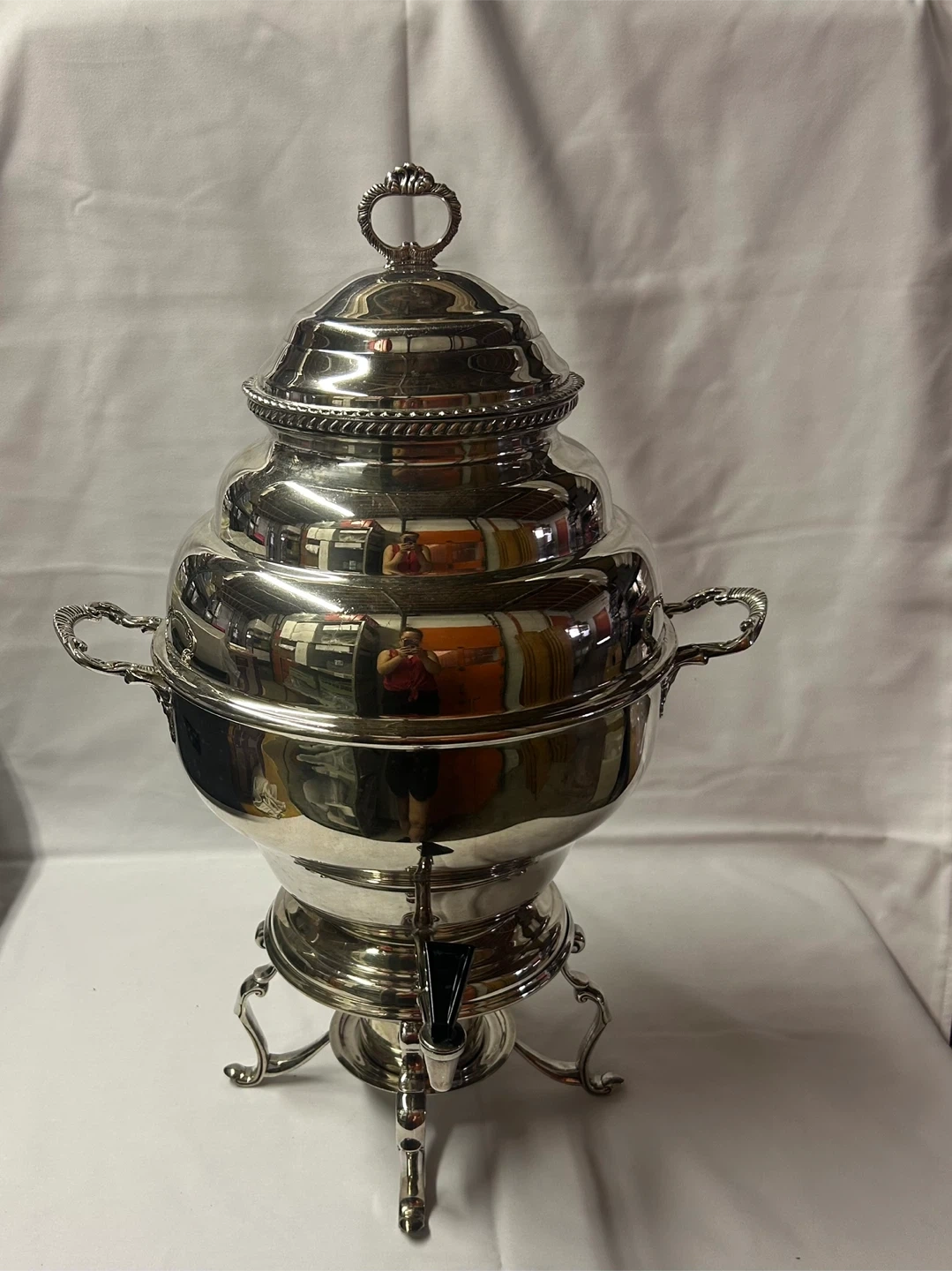Selling a 100 cup silver Samovar. Perfect for hot water, tea or coffee. Will keep beverages hot for hours. Non electric, uses sterno for heat. Ideal for weddings or special events. It's in excellent condition.