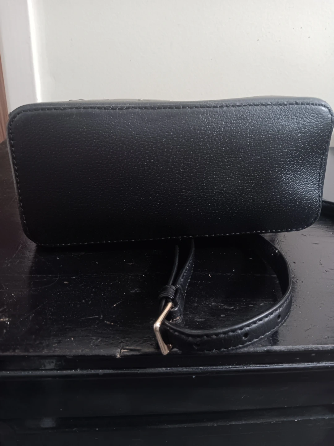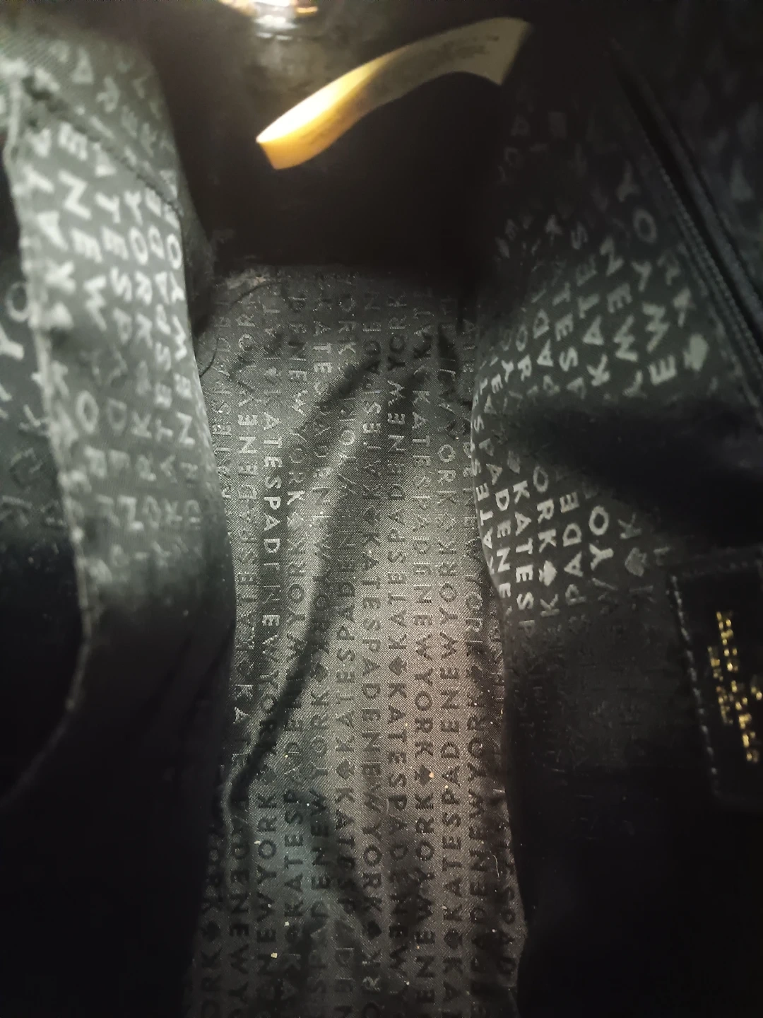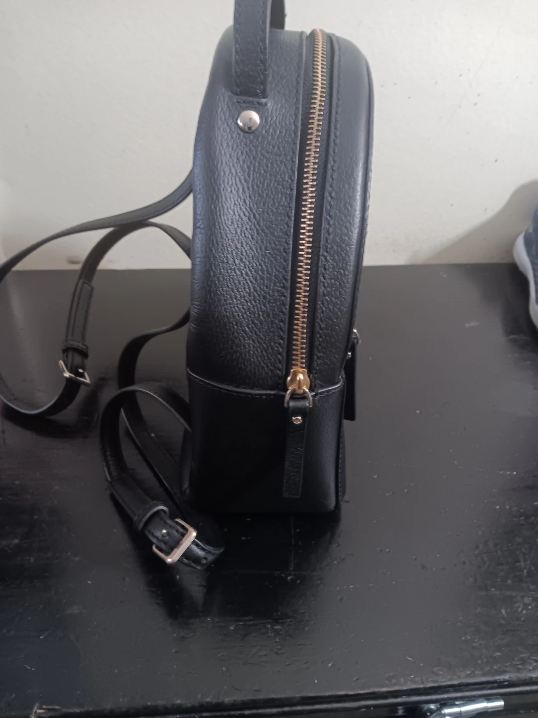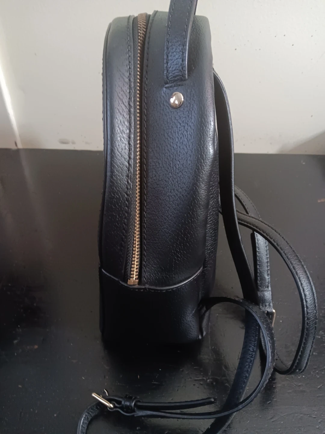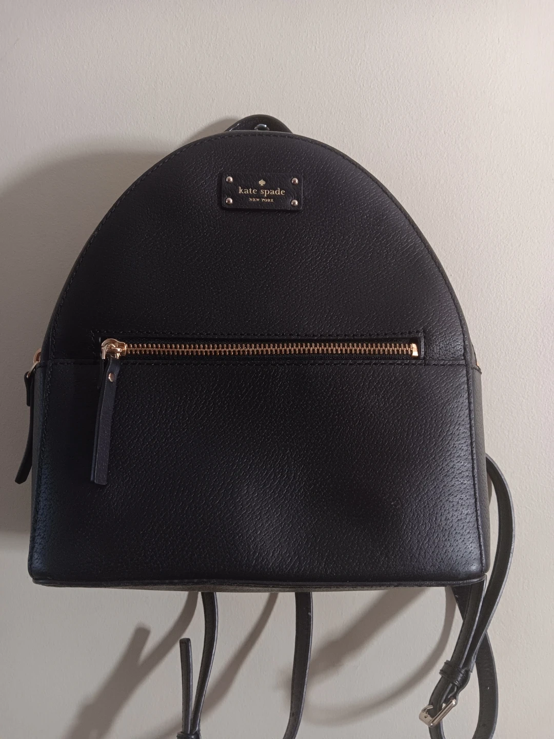 This is a black leather backpack from Kate Spade. It's got a zip-around closure and adjustable shoulder straps. The interior lining has the Kate Spade logo pattern. It's a great size for everyday use! 10\10