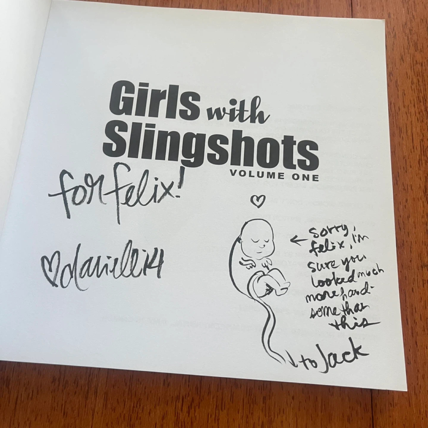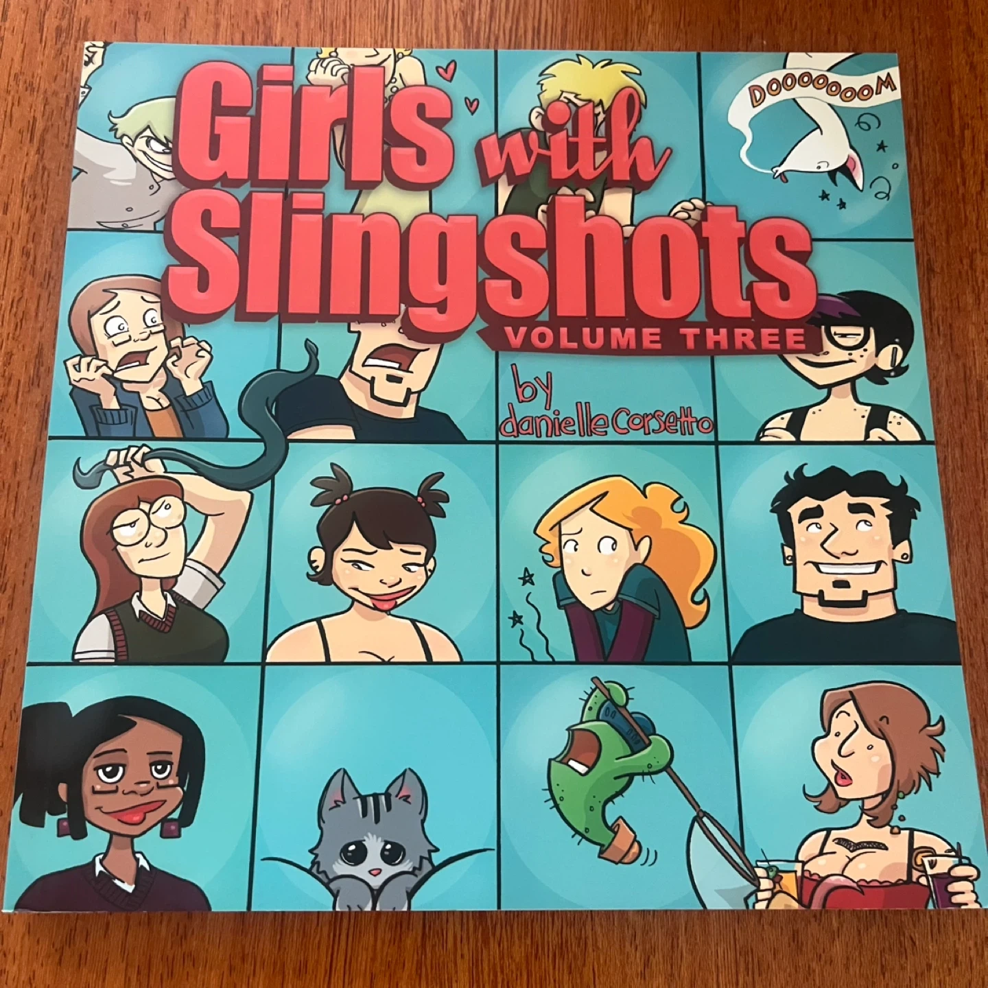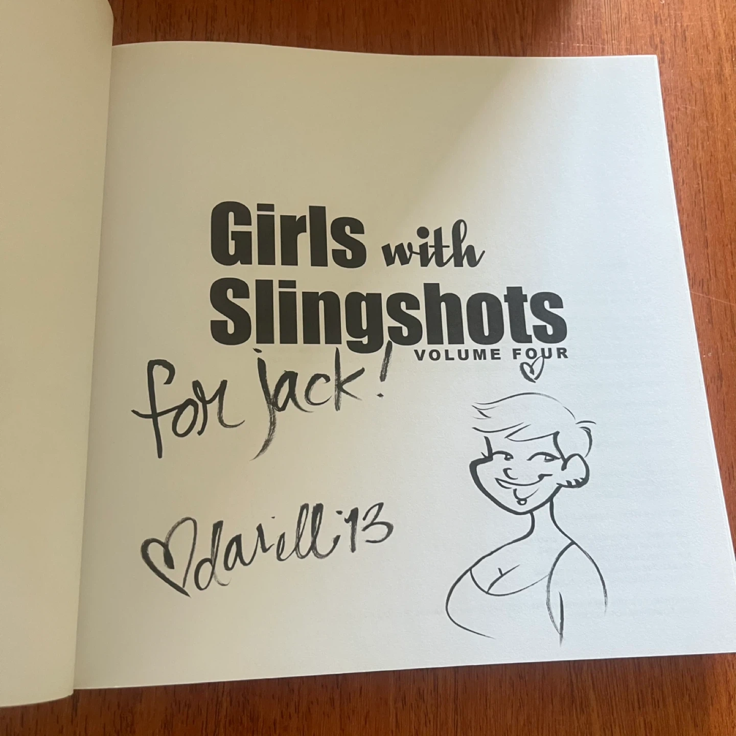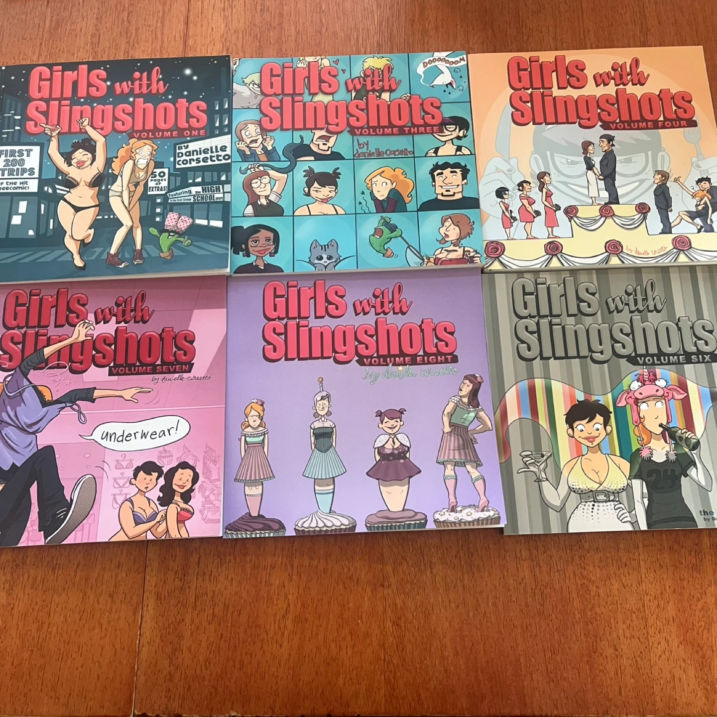 I'm offering a set of 'Girls With Slingshots' comic books, volumes 1, 3, 4, 6, 7 and 8 by Danielle Corsetto. These are used copies in good condition. Volumes 1 and 3 are inscribed, signed and include a personalized drawing inside.