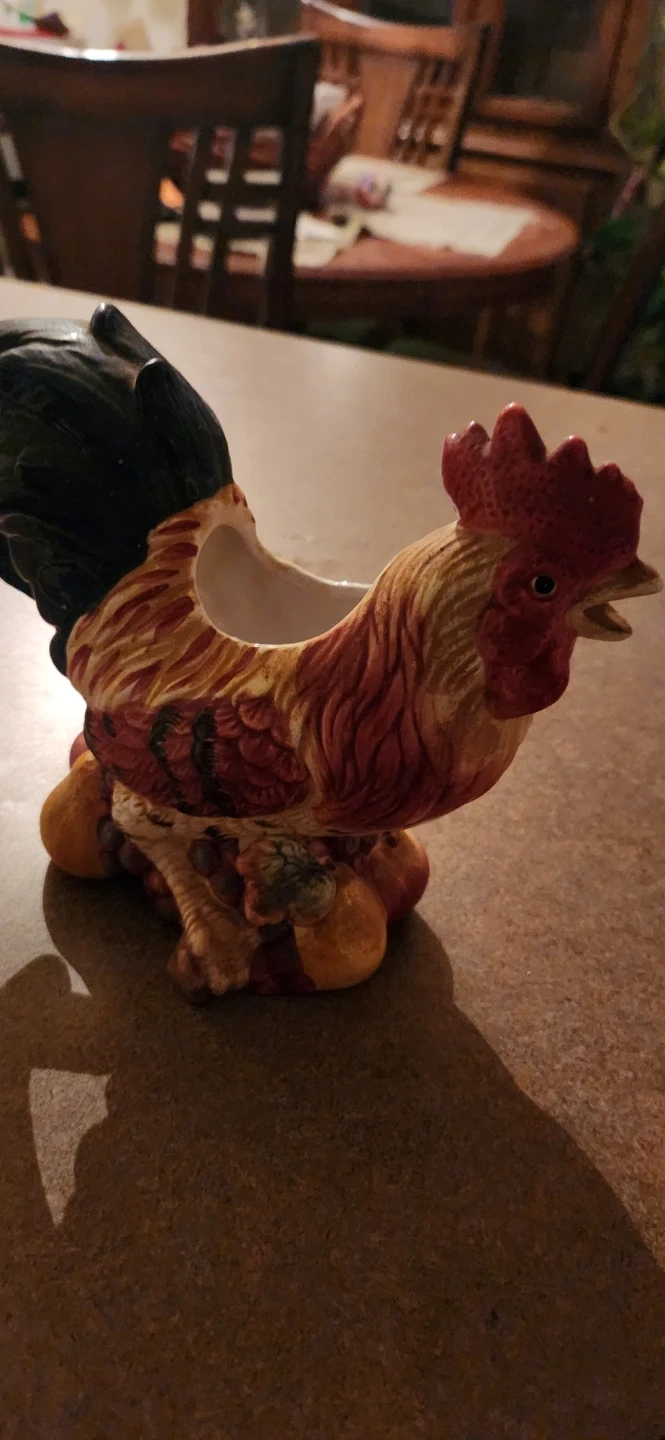 This is a decorative ceramic rooster. It's glazed with vibrant colours and detailed textures. It can be used as a planter or for general home decor.