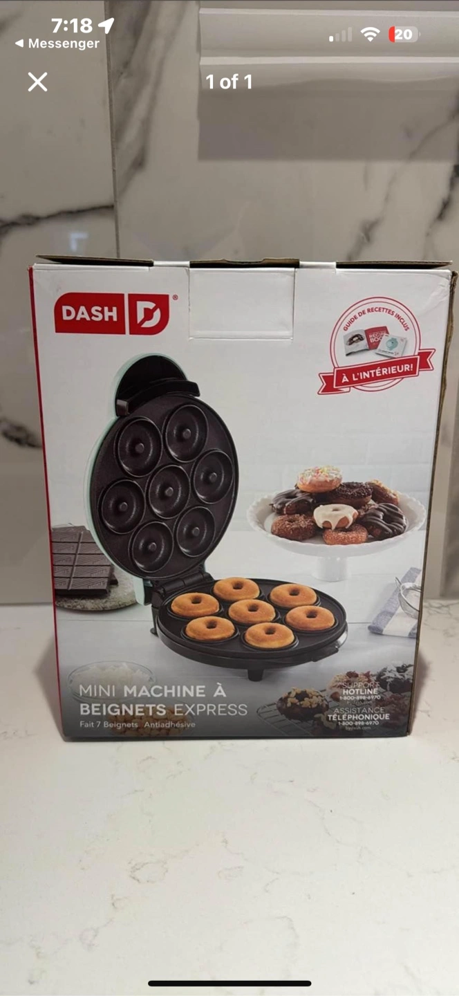 I'm selling a Dash Mini Donut Maker, also known as Beignets Express! It makes 7 mini donuts at once and has a non-stick surface for easy cleanup. Recipe guide included!