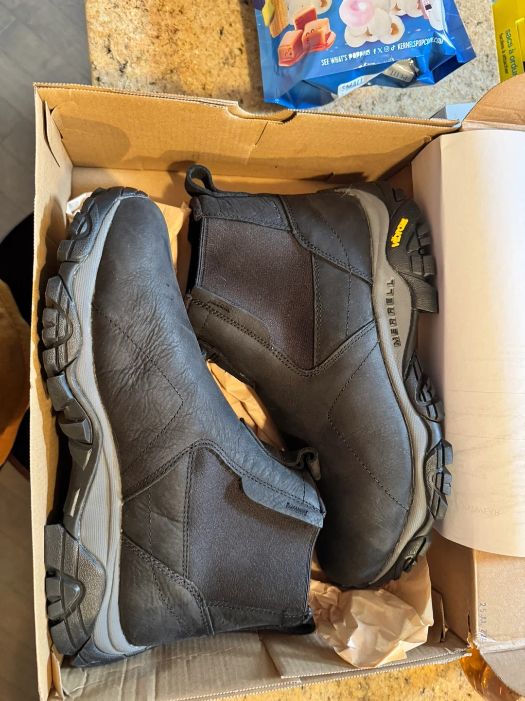 Merrell black Chelsea boots with a waterproof design. They're constructed with a leather and textile upper and feature a durable Vibram sole for excellent traction. Includes original box.