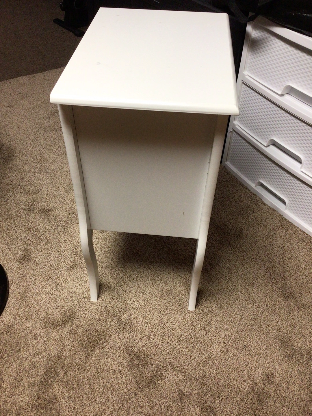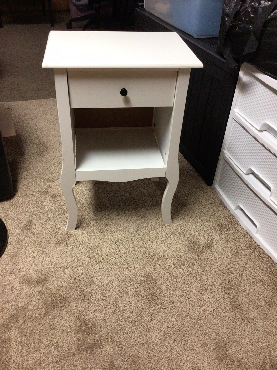 Selling a white wooden nightstand. It features a drawer and an open shelf for storage. Perfect next to a bed or as a small side table!