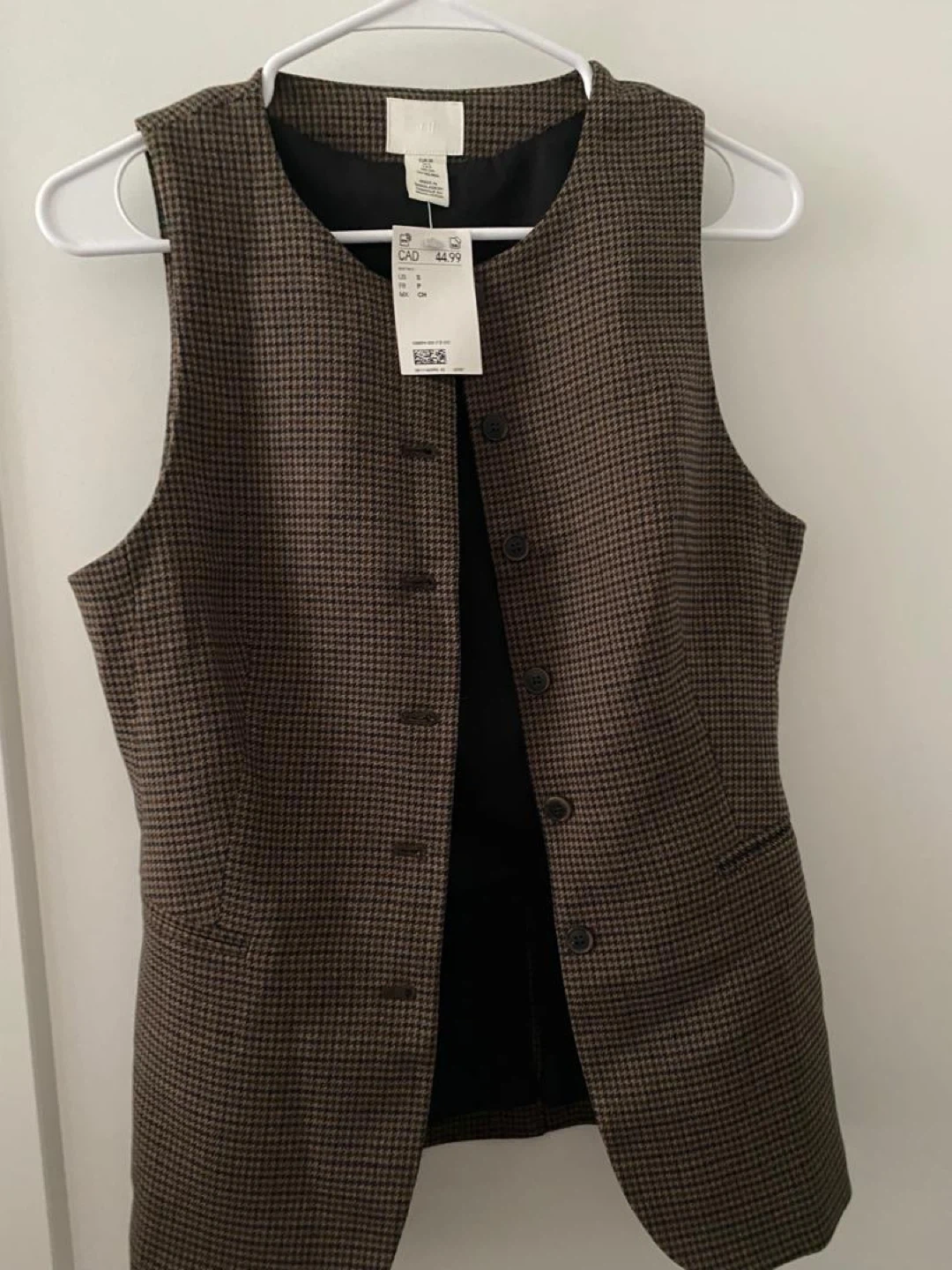 This H&M houndstooth vest comes in a size small. It features a classic button-up front and a tailored fit. This vest is perfect for layering over shirts or dresses.