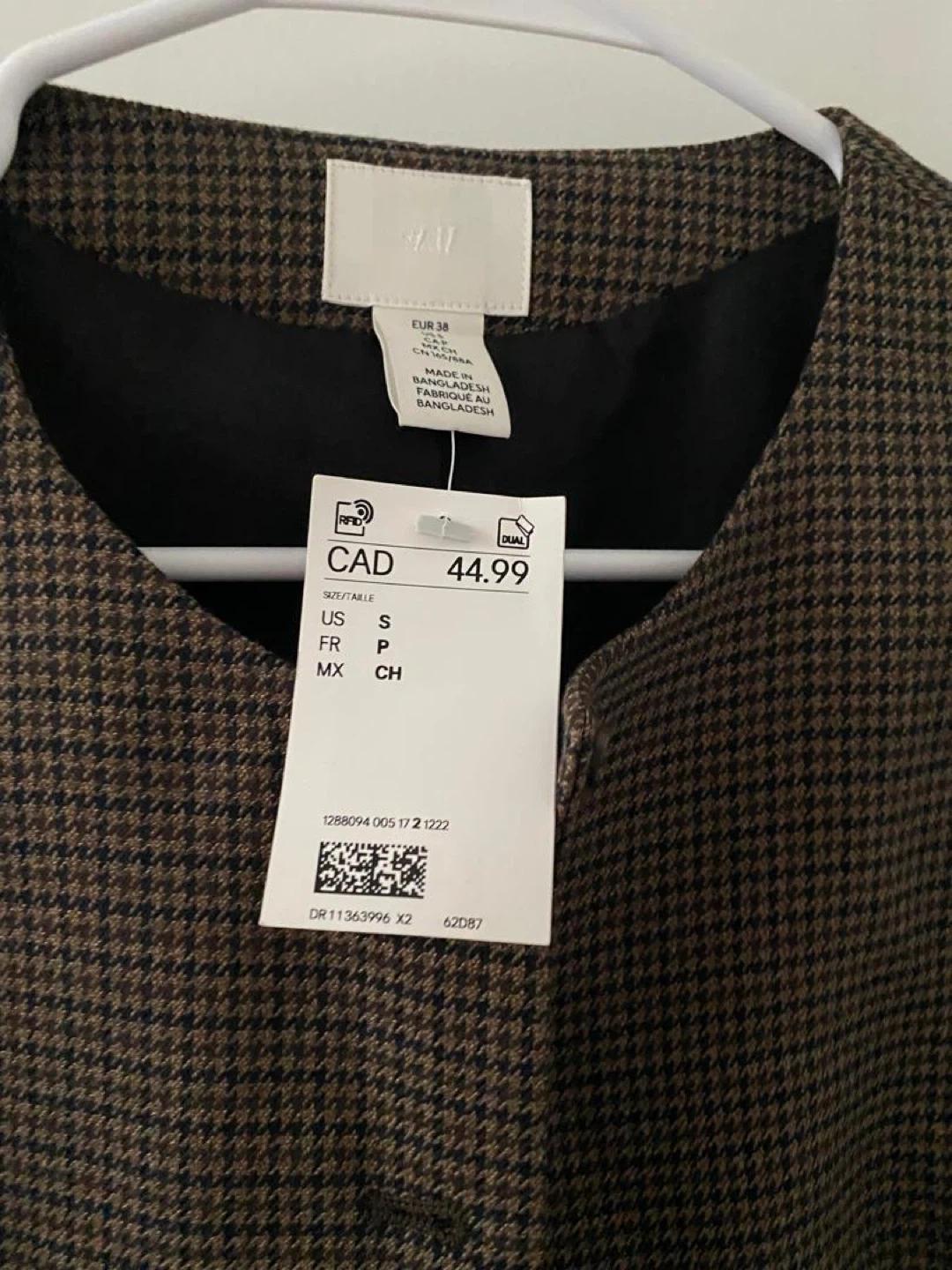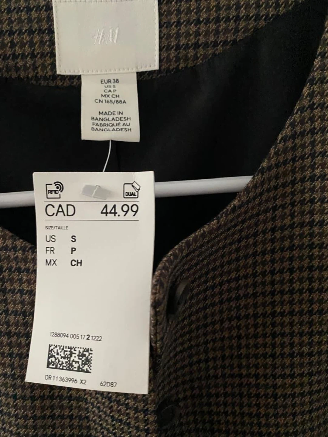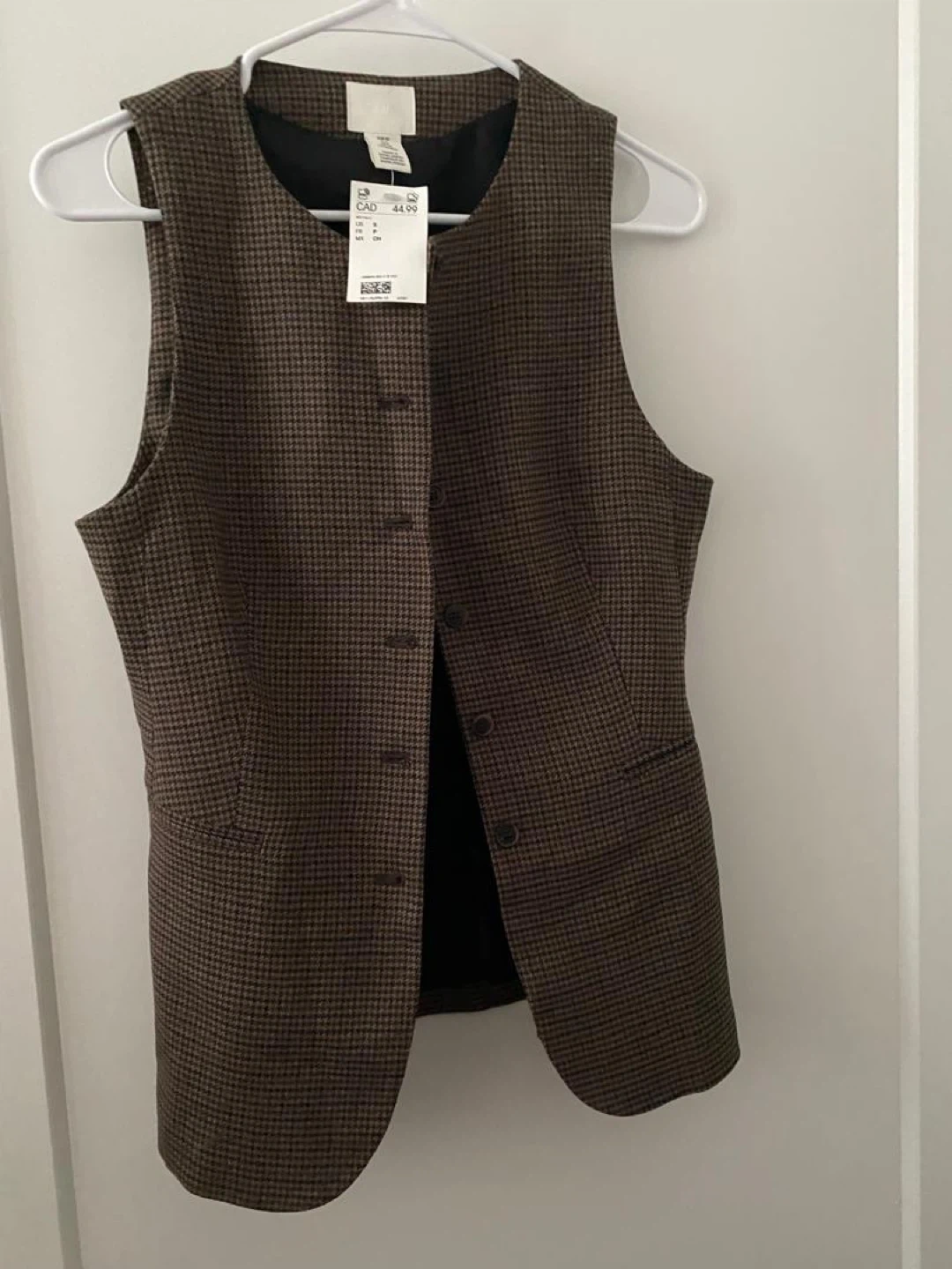 This H&M houndstooth vest comes in a size small. It features a classic button-up front and a tailored fit. This vest is perfect for layering over shirts or dresses.