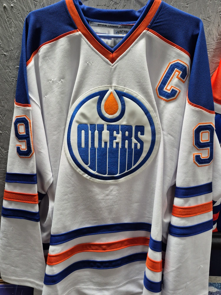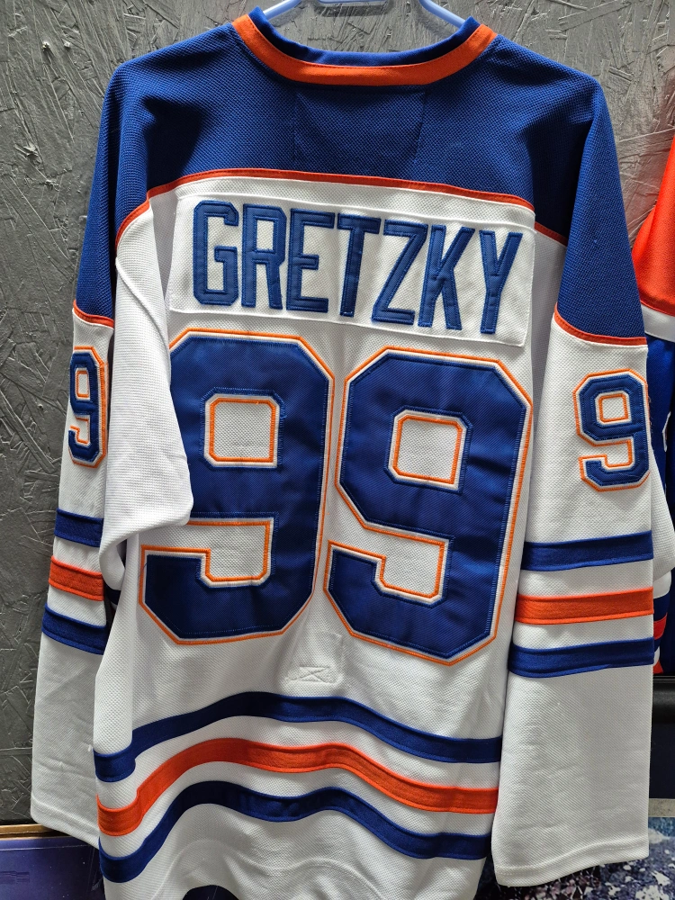 Officially licensed vintage NHL jersey. Gretzky #99. Oilers logo. White with blue and orange accents. Adult size.