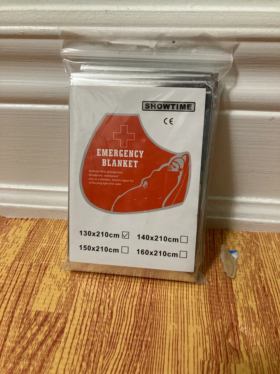 Selling a brand new Showtime Emergency Blanket still sealed in its original packaging! This blanket reflects 90% of body heat and is windproof and waterproof. It can also be used as a shelter or signal for reflecting light and radar. Dimensions are 130cm x 210cm