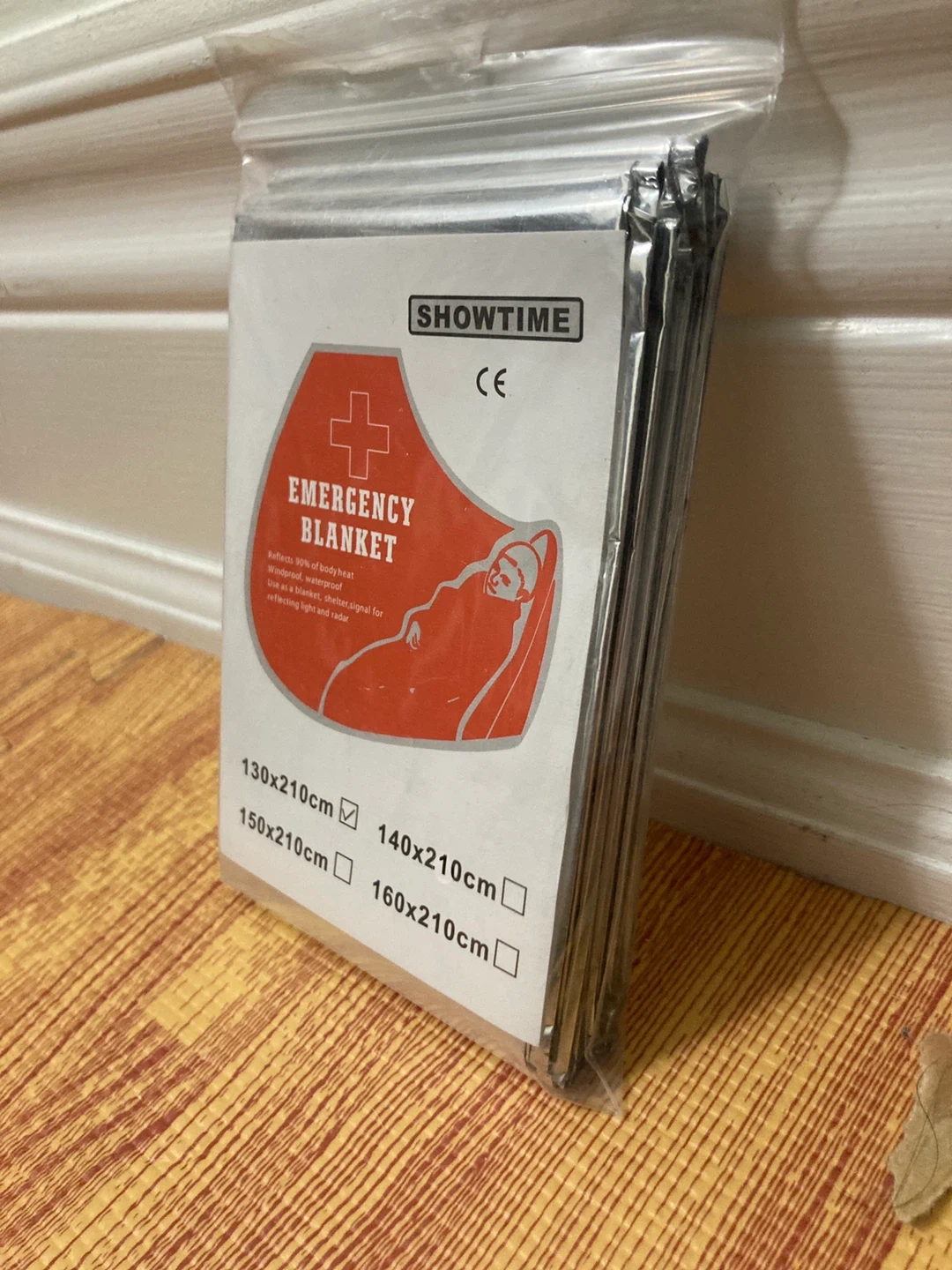 Selling a brand new Showtime Emergency Blanket still sealed in its original packaging! This blanket reflects 90% of body heat and is windproof and waterproof. It can also be used as a shelter or signal for reflecting light and radar. Dimensions are 130cm x 210cm