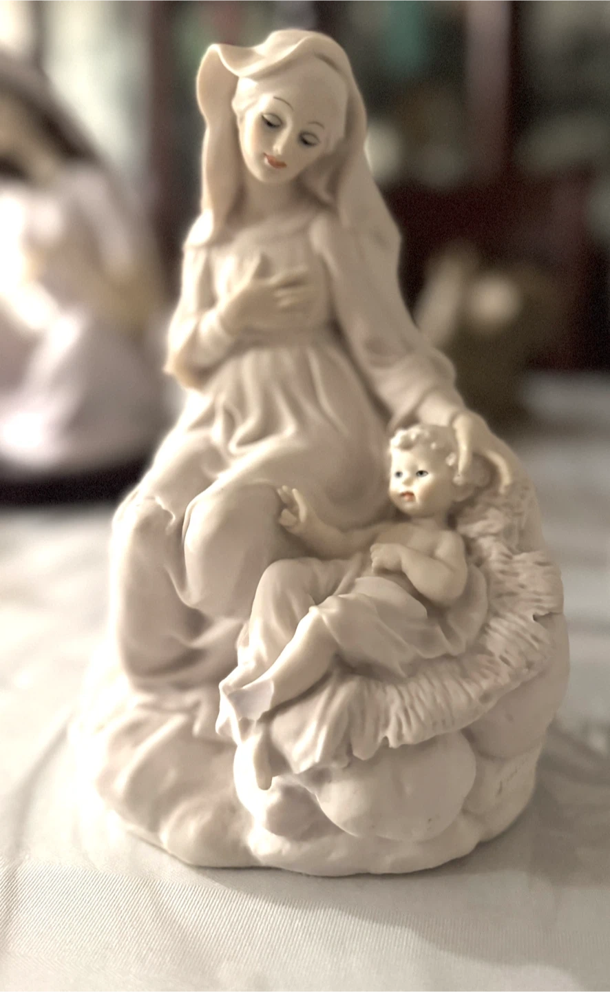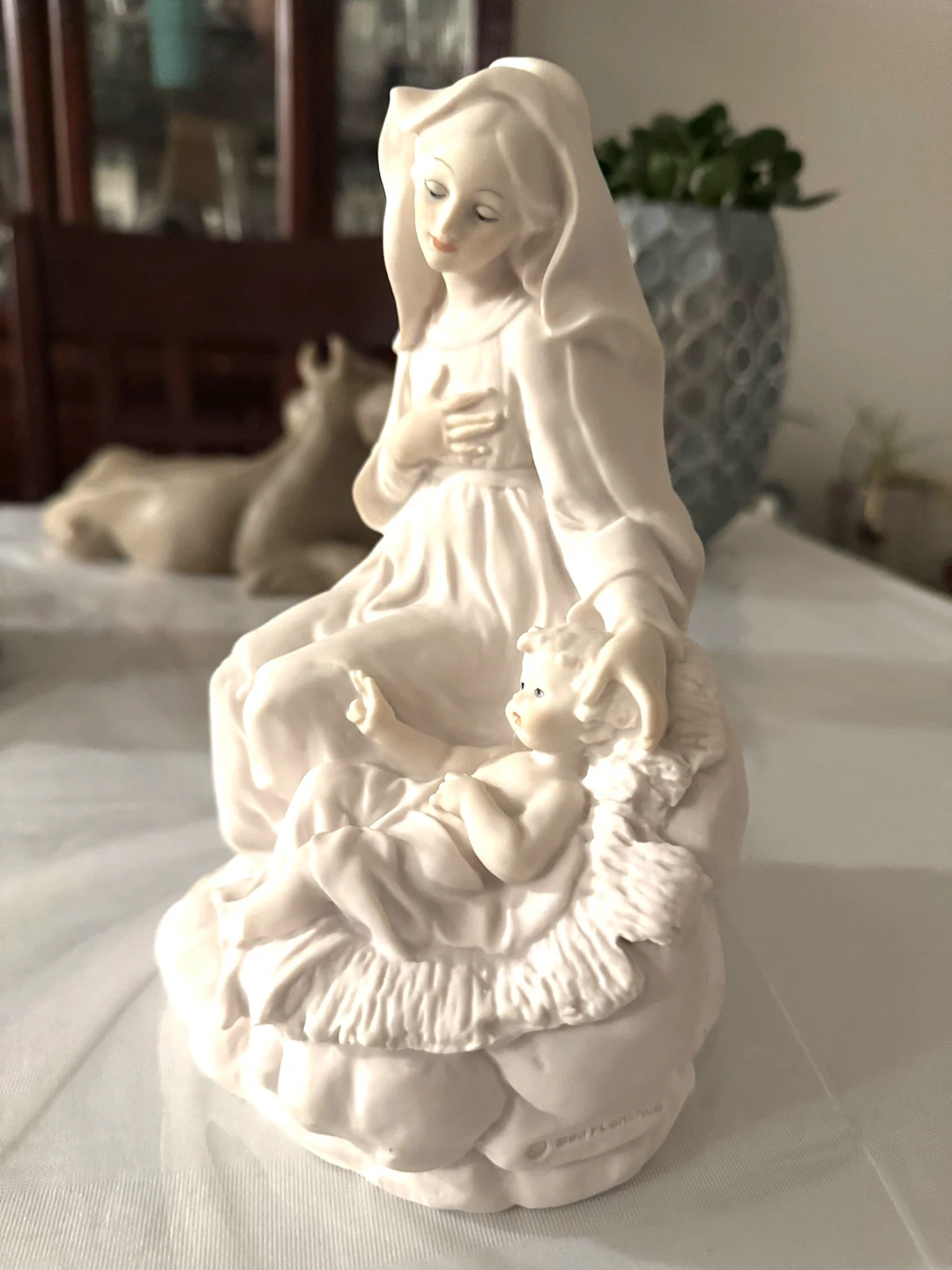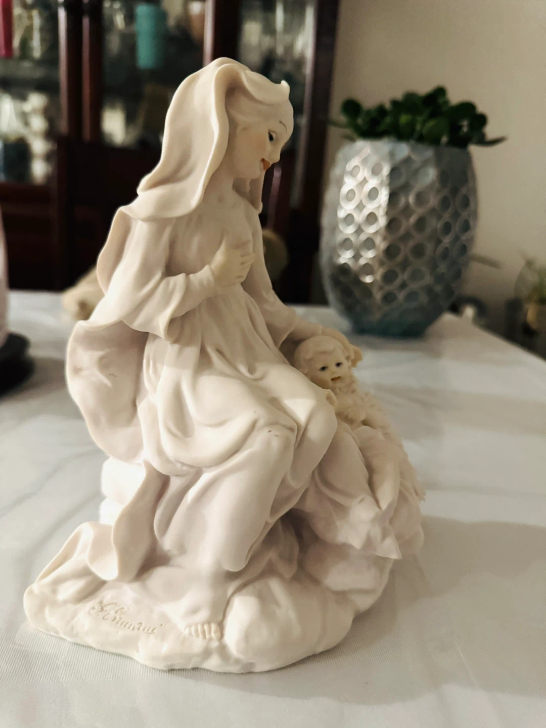 A beautiful Fattorini figurine depicting the Madonna and child. This piece is crafted from ceramic and made in Italy. It's a lovely addition for any mantle or shelf.