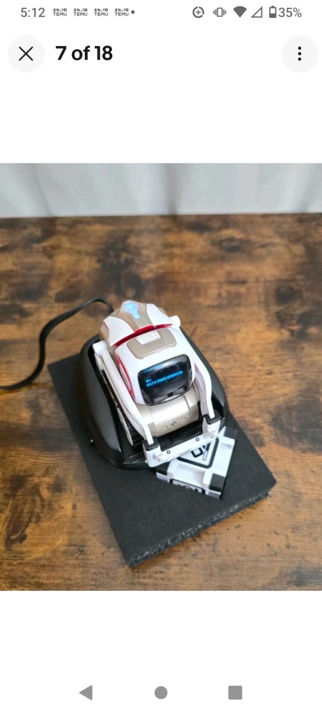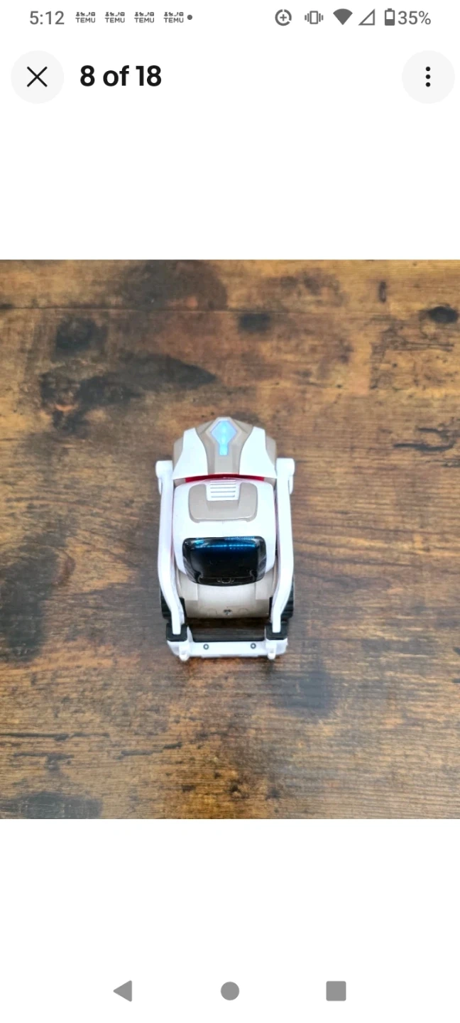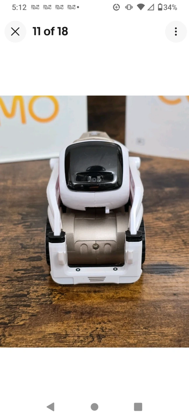 This is a white Anki Cozmo robot with treads. It has a screen that displays blue eyes. It comes with a cube accessory. This robot is a fun interactive toy for kids and adults!