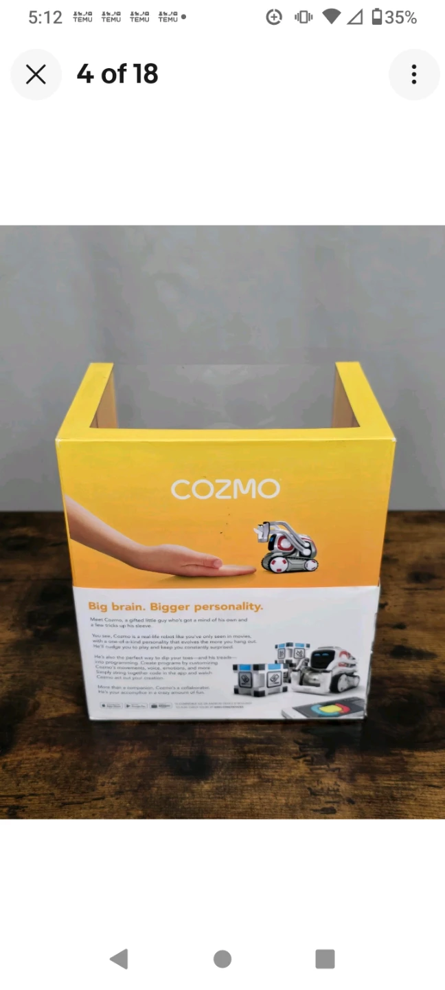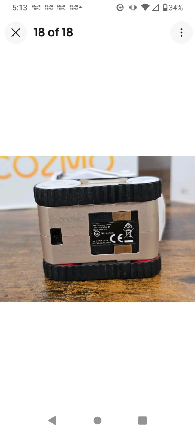 This is a white Anki Cozmo robot with treads. It has a screen that displays blue eyes. It comes with a cube accessory. This robot is a fun interactive toy for kids and adults!