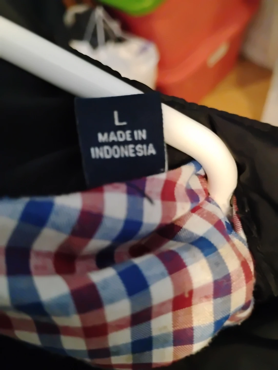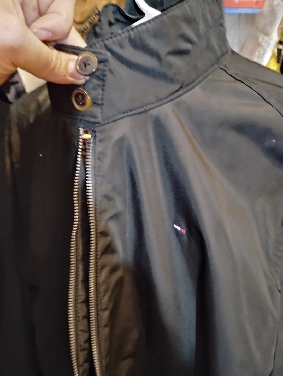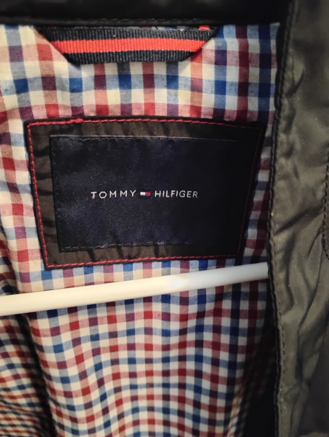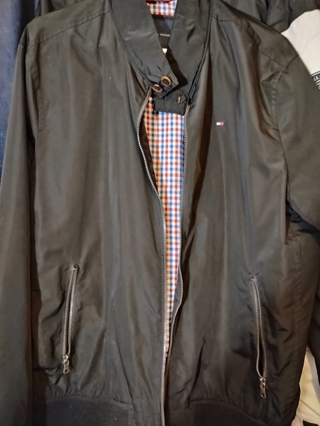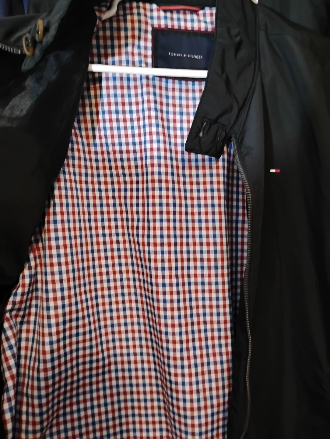 This Tommy Hilfiger jacket is black with a checkered lining.