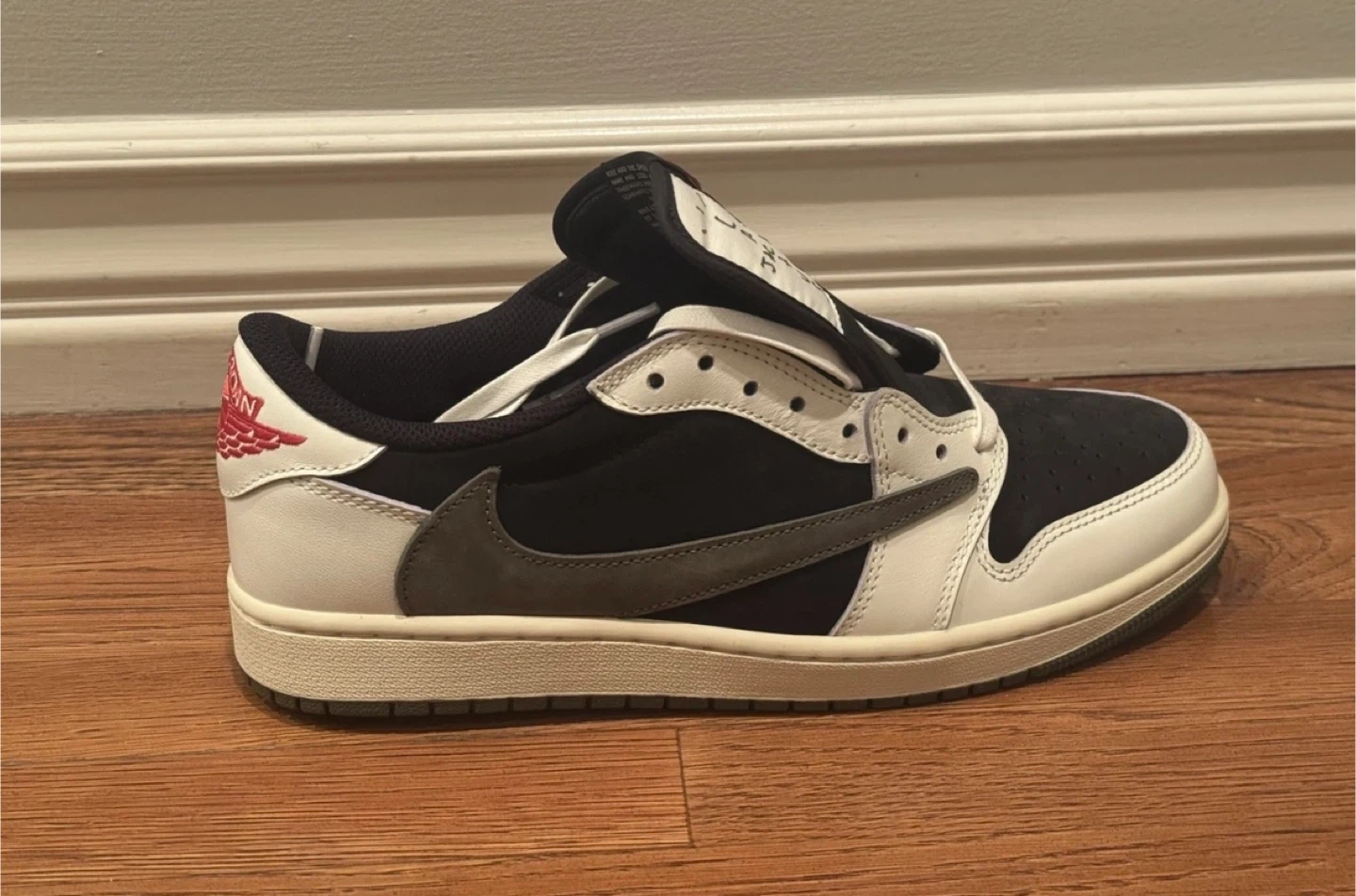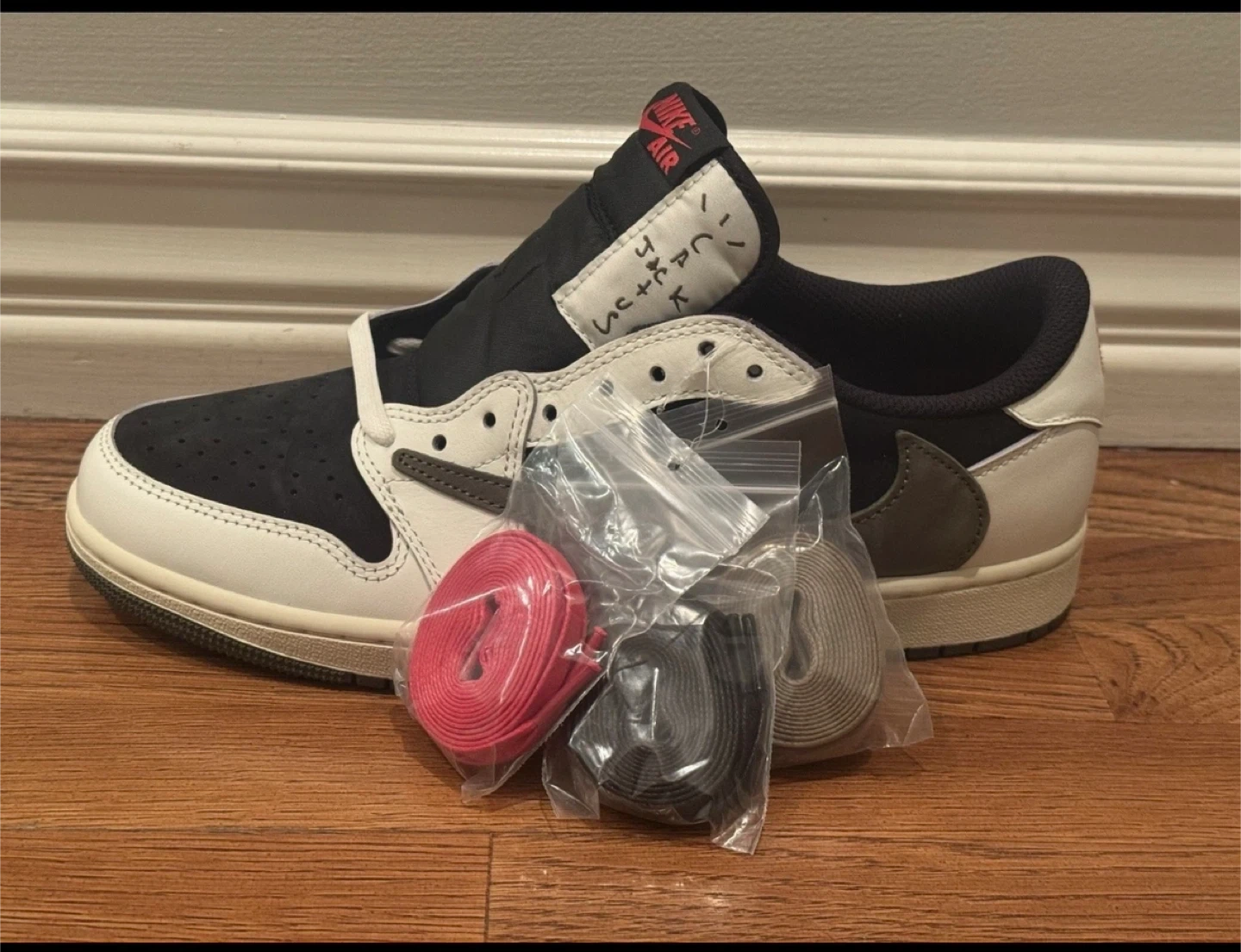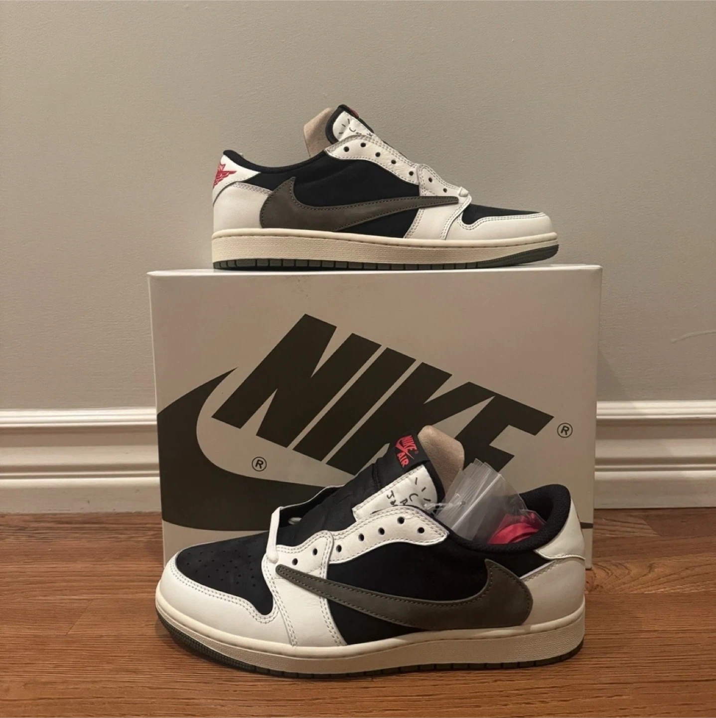 Nike Air Jordan 1 Low sneakers in collaboration with Travis Scott. Features a mix of leather and suede. Includes the original Nike box. These are low-top athletic shoes.