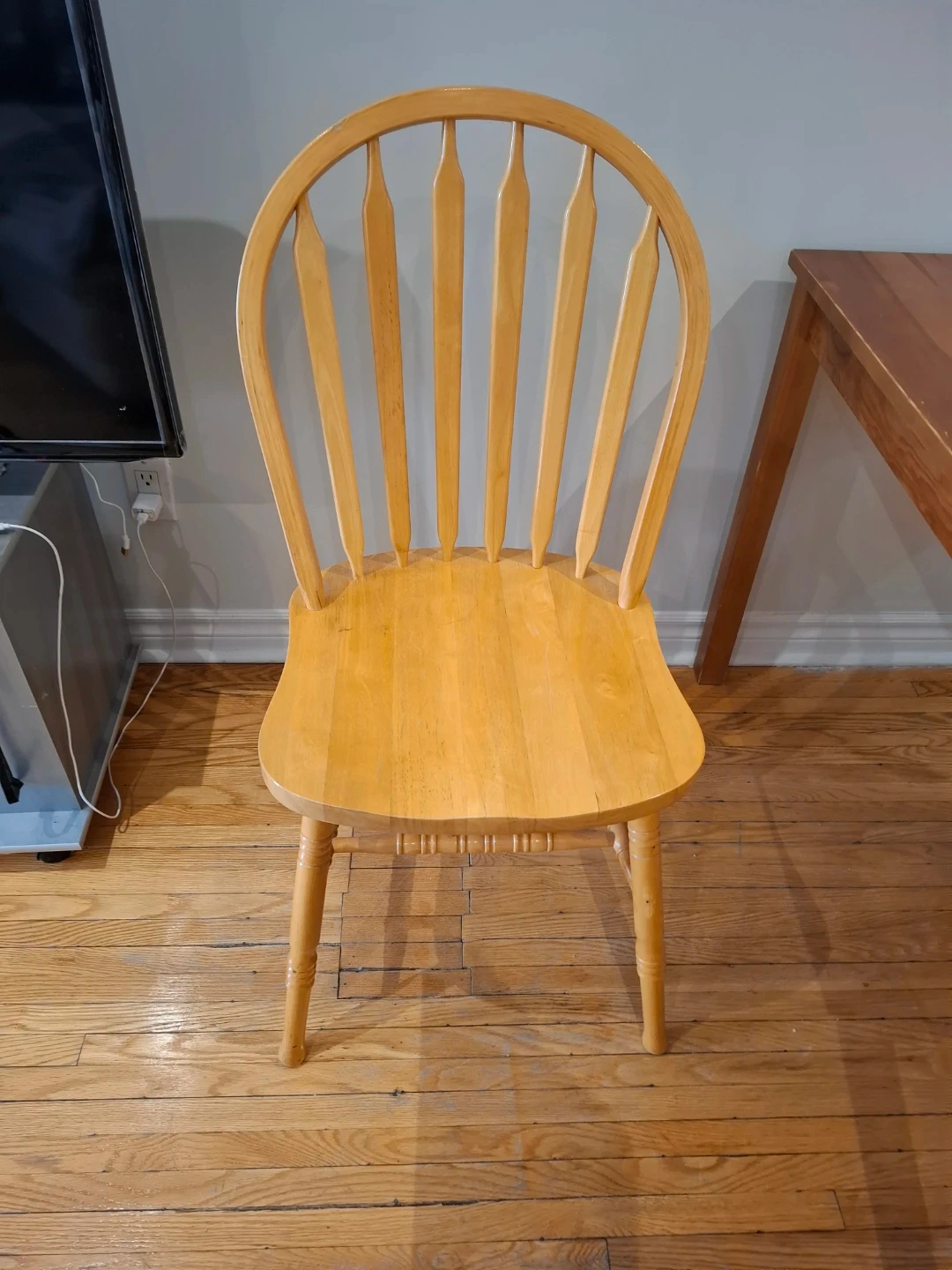 Classic light wood dining chair with a spindle back design. Simple and sturdy construction. Perfect for a kitchen or dining room.