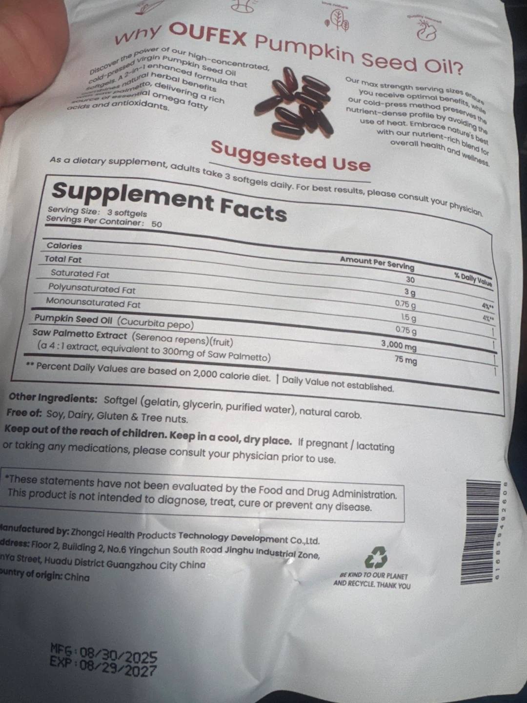 Oufex Virgin Pumpkin Seed Oil with Saw Palmetto - 150 Softgels