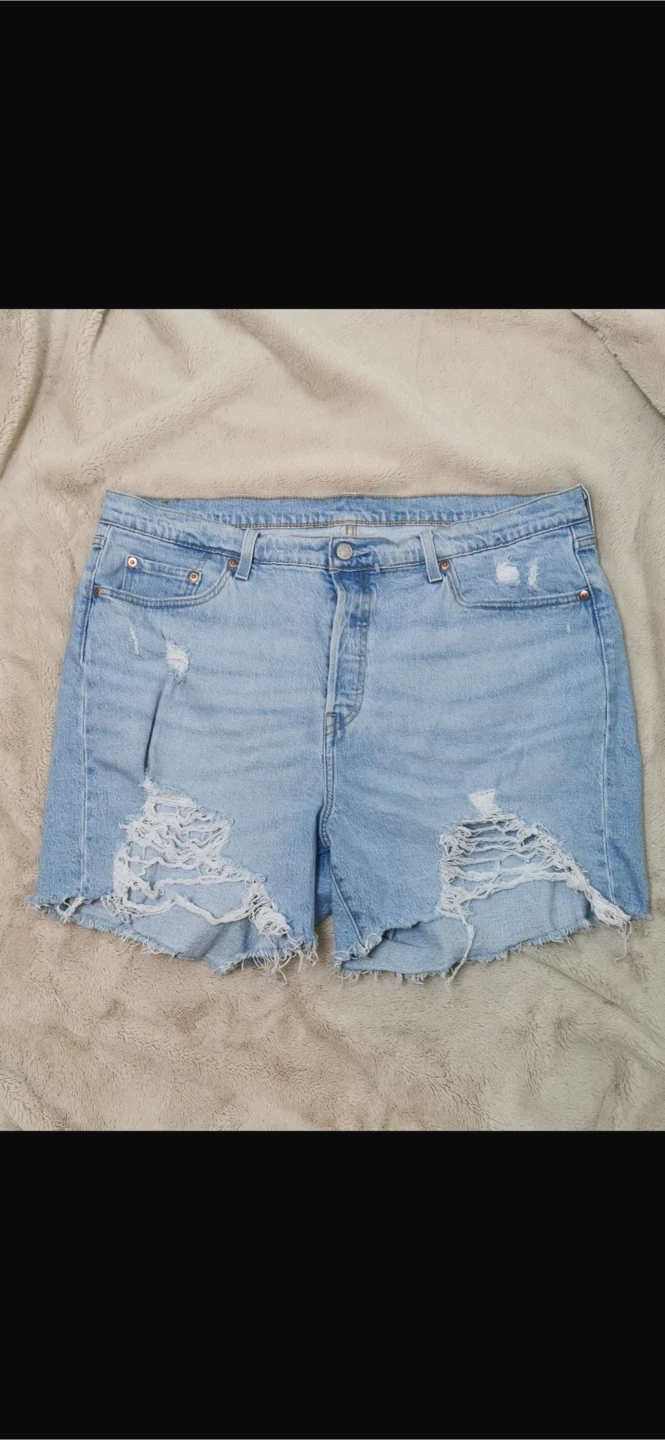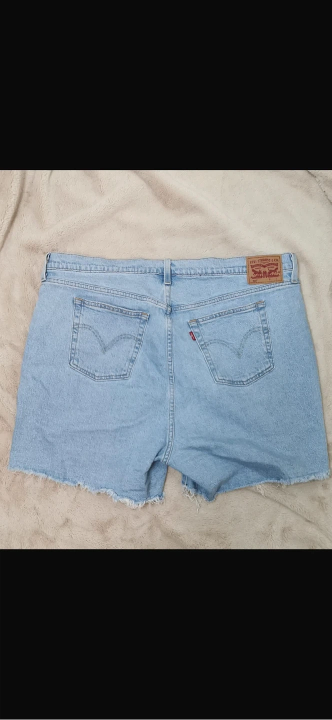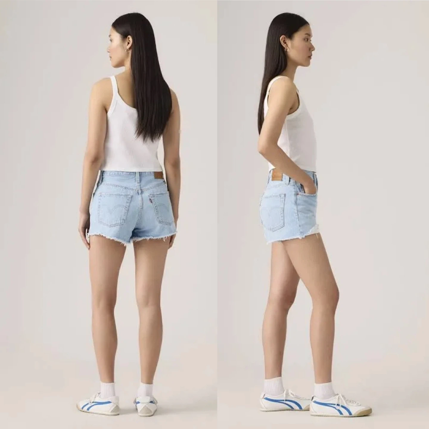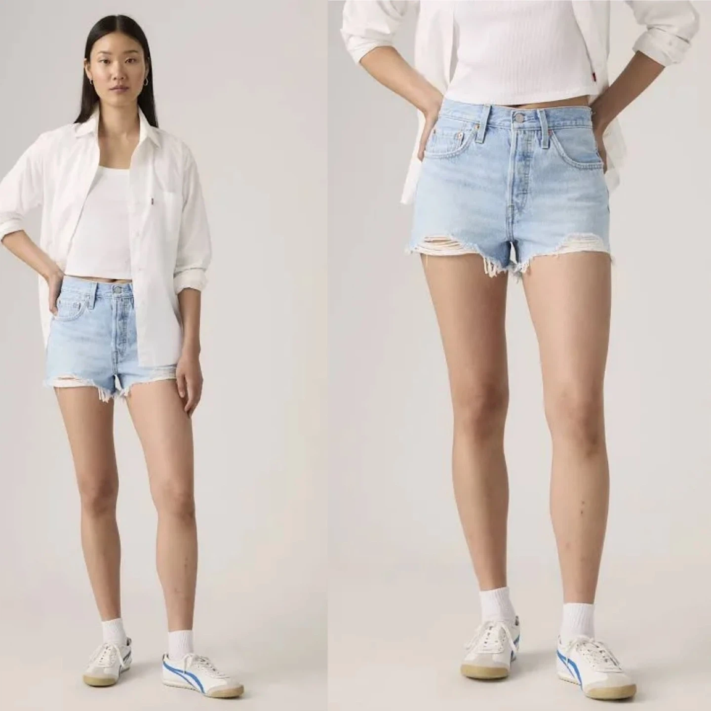 Classic light wash denim shorts from Levi's. Features a high-rise fit with a button fly and distressed detailing. Denim material.