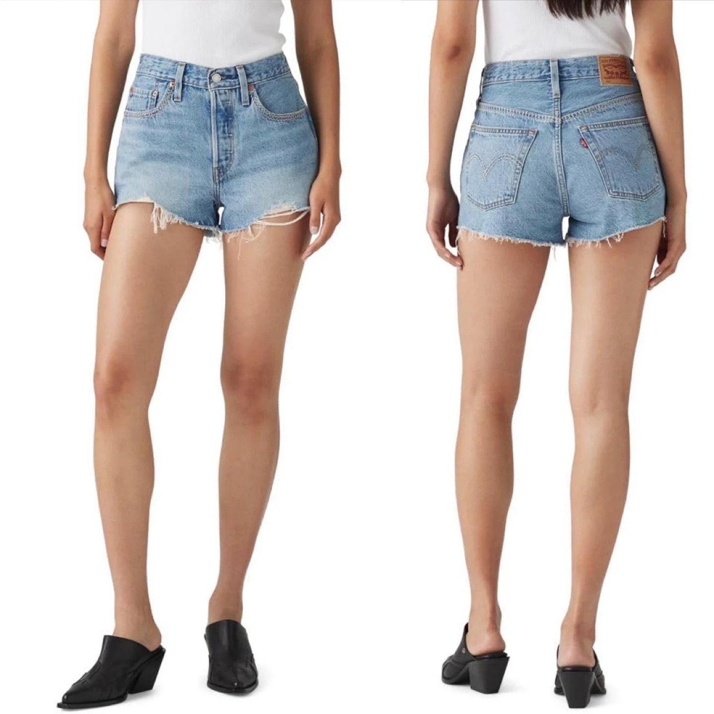 Classic light wash denim shorts from Levi's. Features a high-rise fit with a button fly and distressed detailing. Denim material.