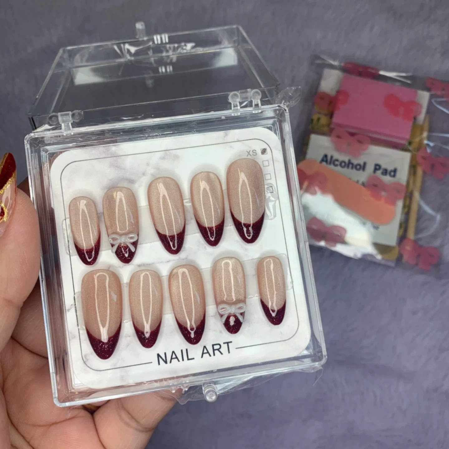 Selling a set of press-on nails in size XS. They come in a clear case with a pack of alcohol pads. Perfect for a quick and easy manicure!